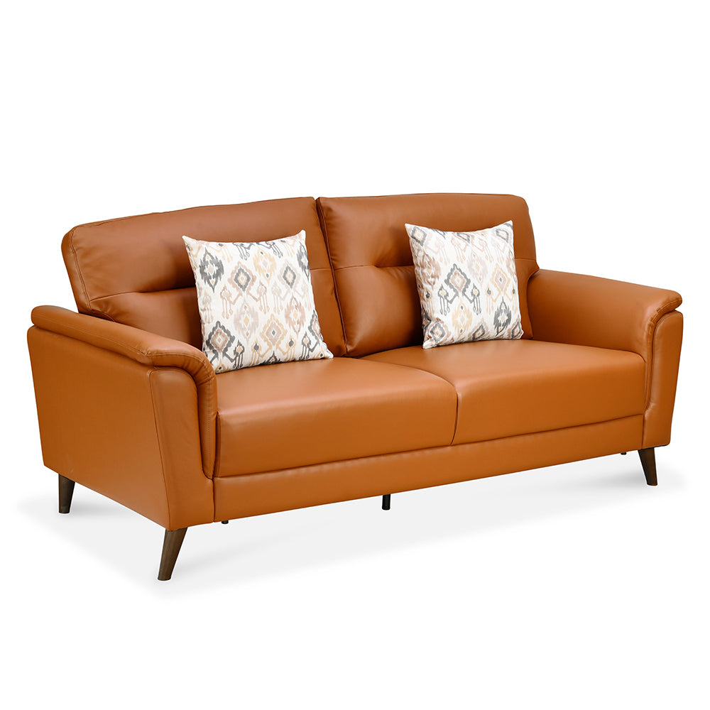 The Nilkamal Homes Aiden 3-Seater Sofa offers a luxurious and stylish seating option with modern aesthetics. Crafted from robust pinewood and engineered wood, it features elegant PVC legs for enduring support. The plush foam seat and back deliver unparalleled comfort, while the double-layered wing armrests and centre tufted backrest exude sophistication. Its tan PVC upholstery, with a leather-like finish, is flame-retardant, abrasion-resistant, and UV-resistant. The high backrest loose cushions and accompanying throw cushions elevate comfort, making it an exquisite addition to any living space. This spacious 3-seater design fits perfectly in chic modern homes or offices, seamlessly blending comfort, durability, and contemporary style to ensure both functionality and elegance.