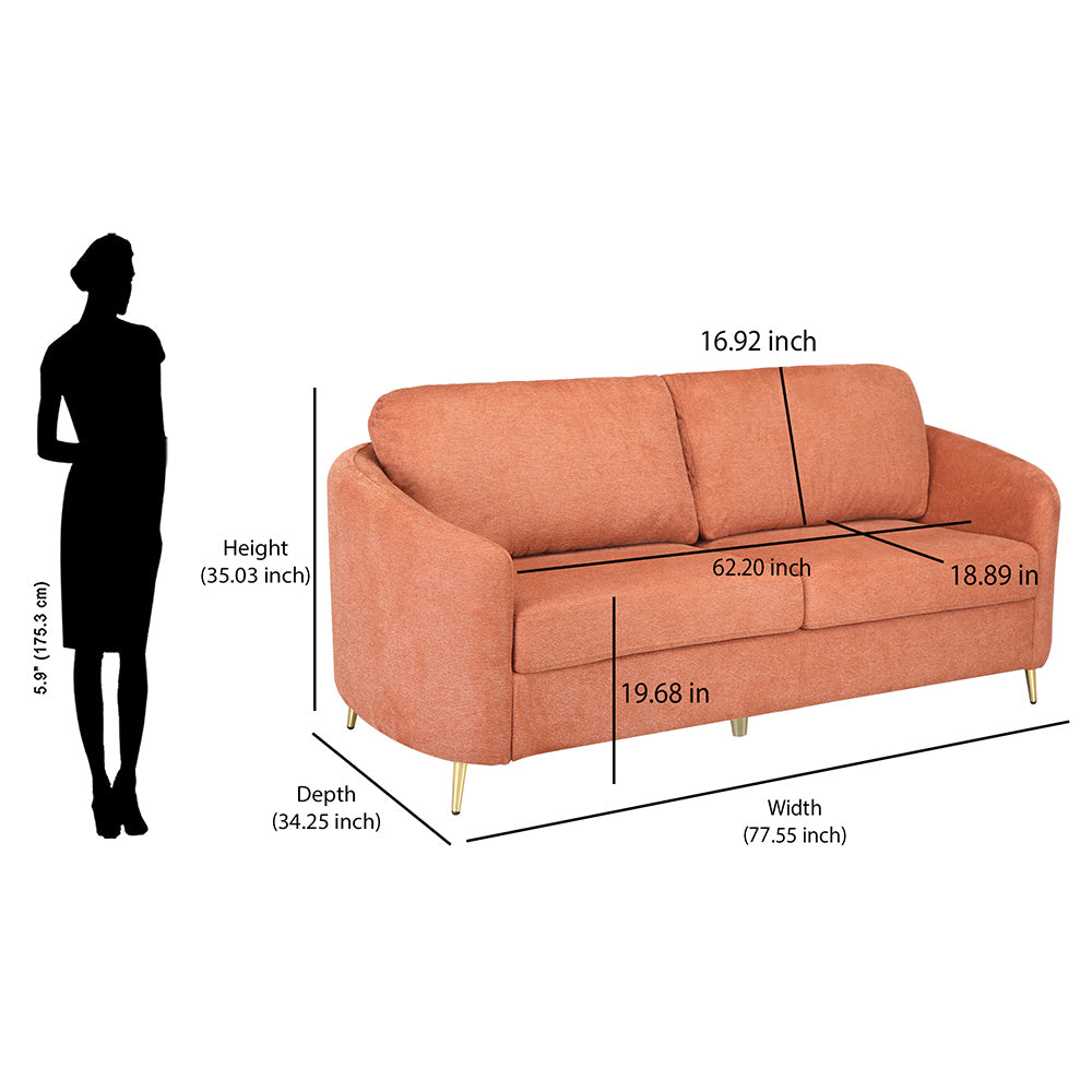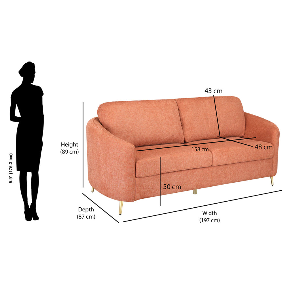 The Nilkamal Homes Arch 3-Seater Sofa stands out with its modern and stylish curved arch armrest design, making a statement in any living room. Constructed with a sturdy pine wood and engineered wood frame, it ensures strength and durability. Enjoy unmatched comfort with multi-layer foam in the seat cushion and high-density racron fibres in the backrest cushion, providing a cosy seating experience. The rich rust-coloured chenille fabric upholstery adds sophistication to your decor, while gold-plated metal legs enhance the overall chic and elegant look. Perfect for accommodating guests or as the centrepiece in a larger room, this 3-seater offers ample seating with a touch of elegance.
