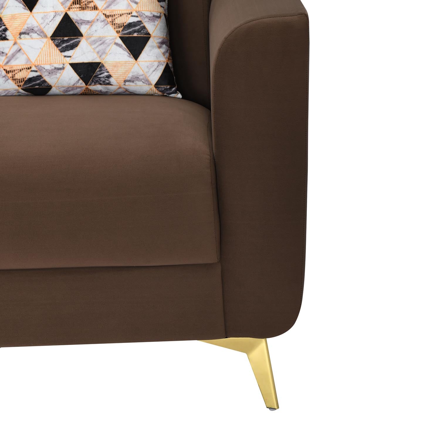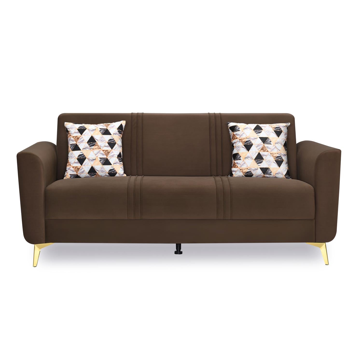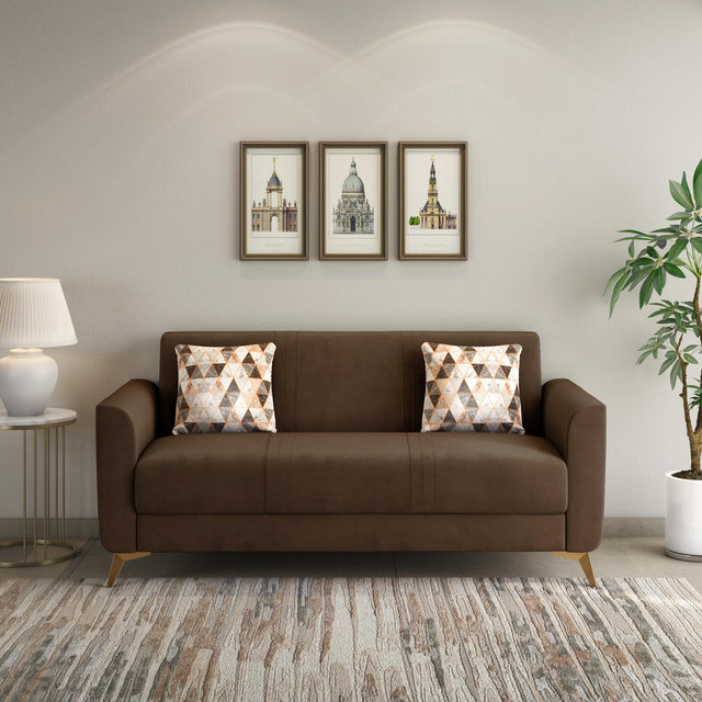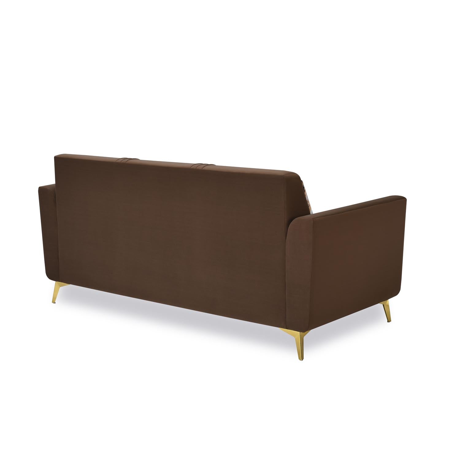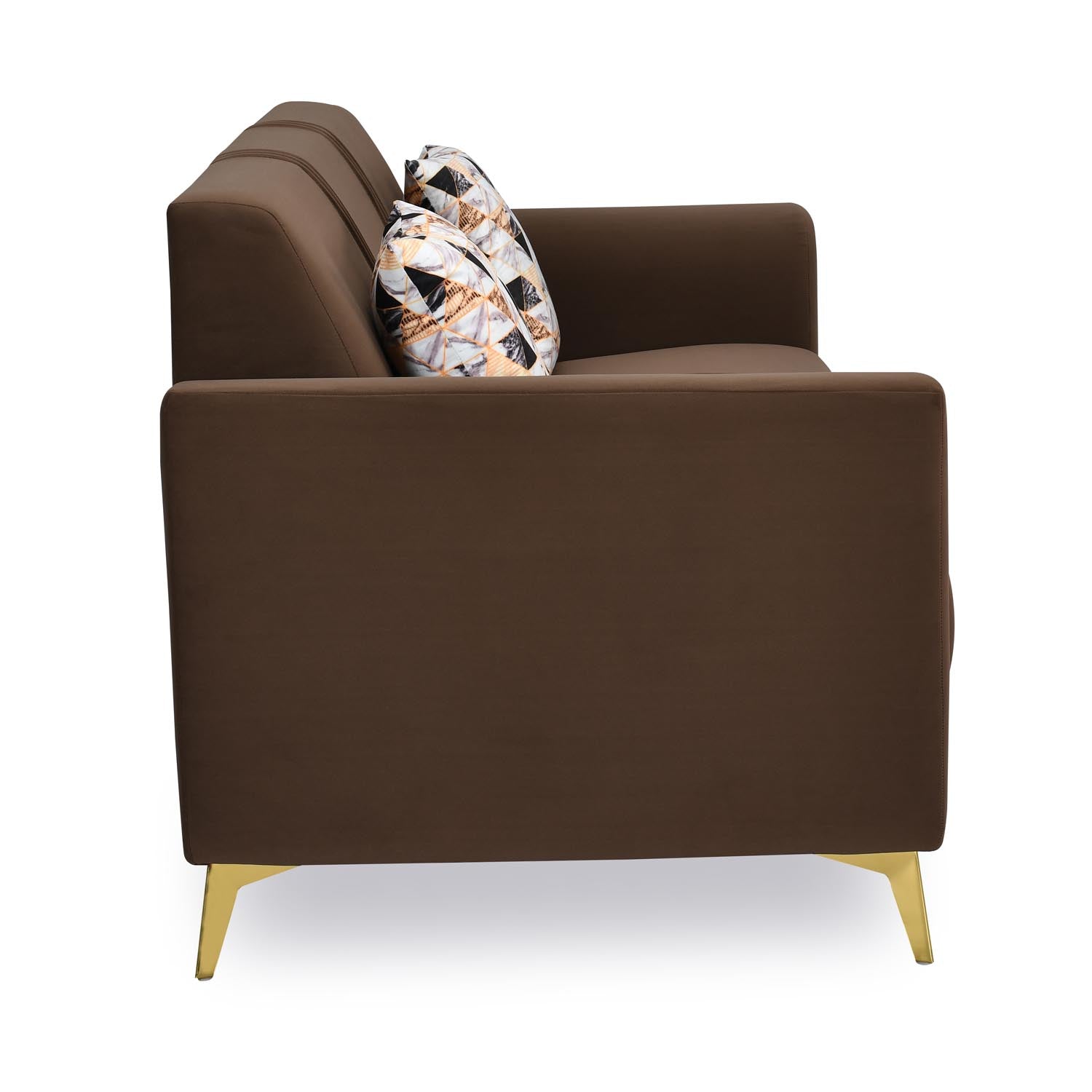 Nilkamal Homes' Cooper 3-Seater Sofa brings warmth and sophistication to your space with its rich brown tone, creating an earthy and inviting ambiance. The well-cushioned seat ensures perfect comfort, whether you're lounging or enjoying a quiet read. Upholstered in smooth, ultra-sheen polyester, it enhances the sofa’s natural charm while adding a touch of elegance. Sleek gold-finish metal legs provide a striking contrast to the earthy fabric, delivering a refined, upscale accent. Crafted with a solid pine wood and engineered wood base, the Cooper Sofa offers lasting strength and durability for everyday use. As a 3-seater, it delivers generous seating capacity, perfect for hosting guests or bringing the whole family together in comfort and elegance.