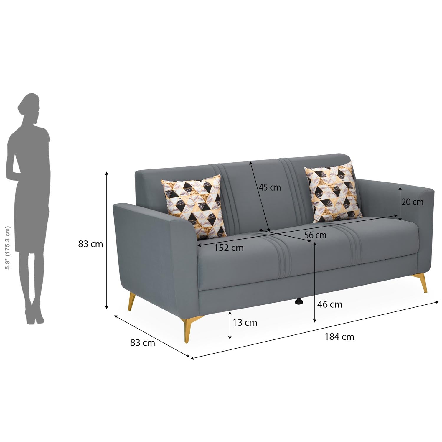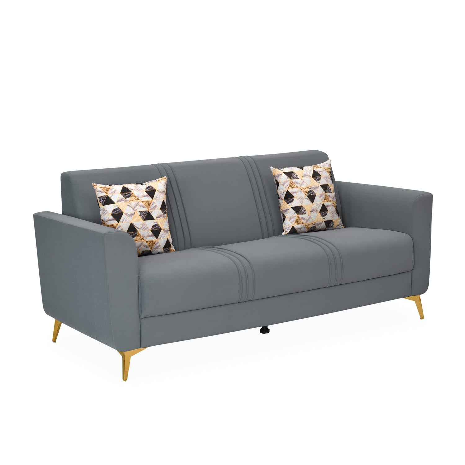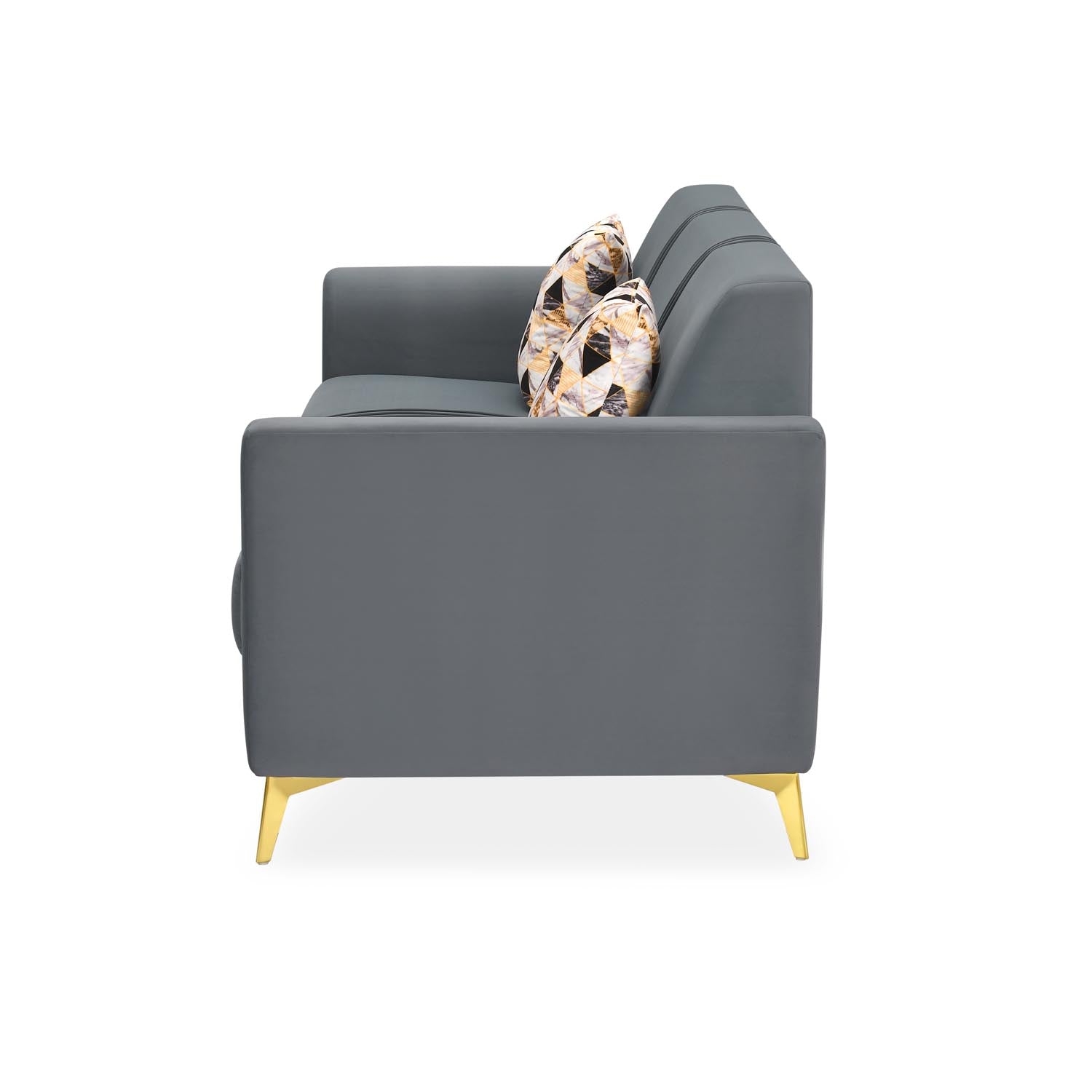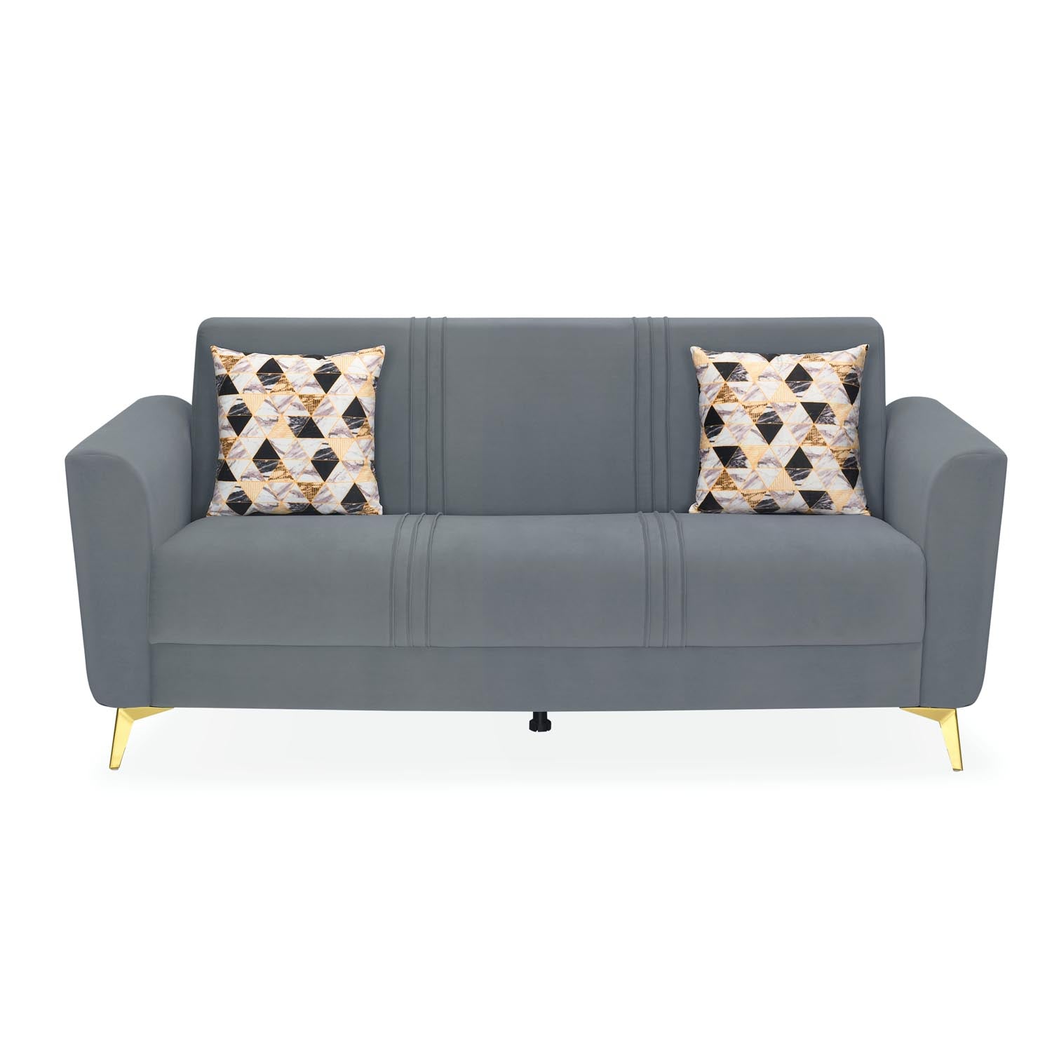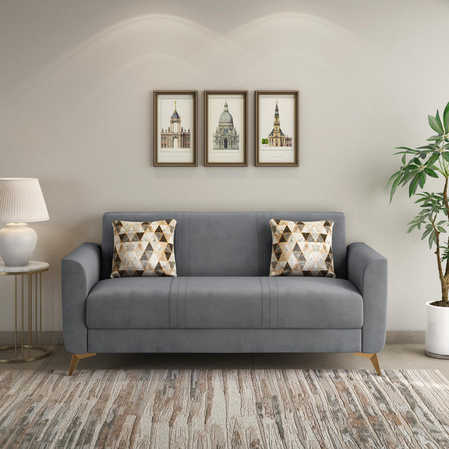 Nilkamal Homes' Cooper 3-Seater Sofa showcases a sleek, modern metallic grey shade that brings calm, balance, and a refined sense of sophistication to your living space. Its well-cushioned seat offers exceptional comfort, making it ideal for relaxing or reading. The ultra-sheen polyester upholstery enhances the sofa’s organic charm with a smooth, polished finish. Sleek gold-finish metal legs create a striking contrast against the grey tone, adding a luxurious accent. Built on a solid pine wood and engineered wood base, the Cooper Sofa ensures lasting durability and support for everyday use. As a 3-seater, it provides expansive comfort ideal for family lounging, hosting guests, or stretching out with complete ease.