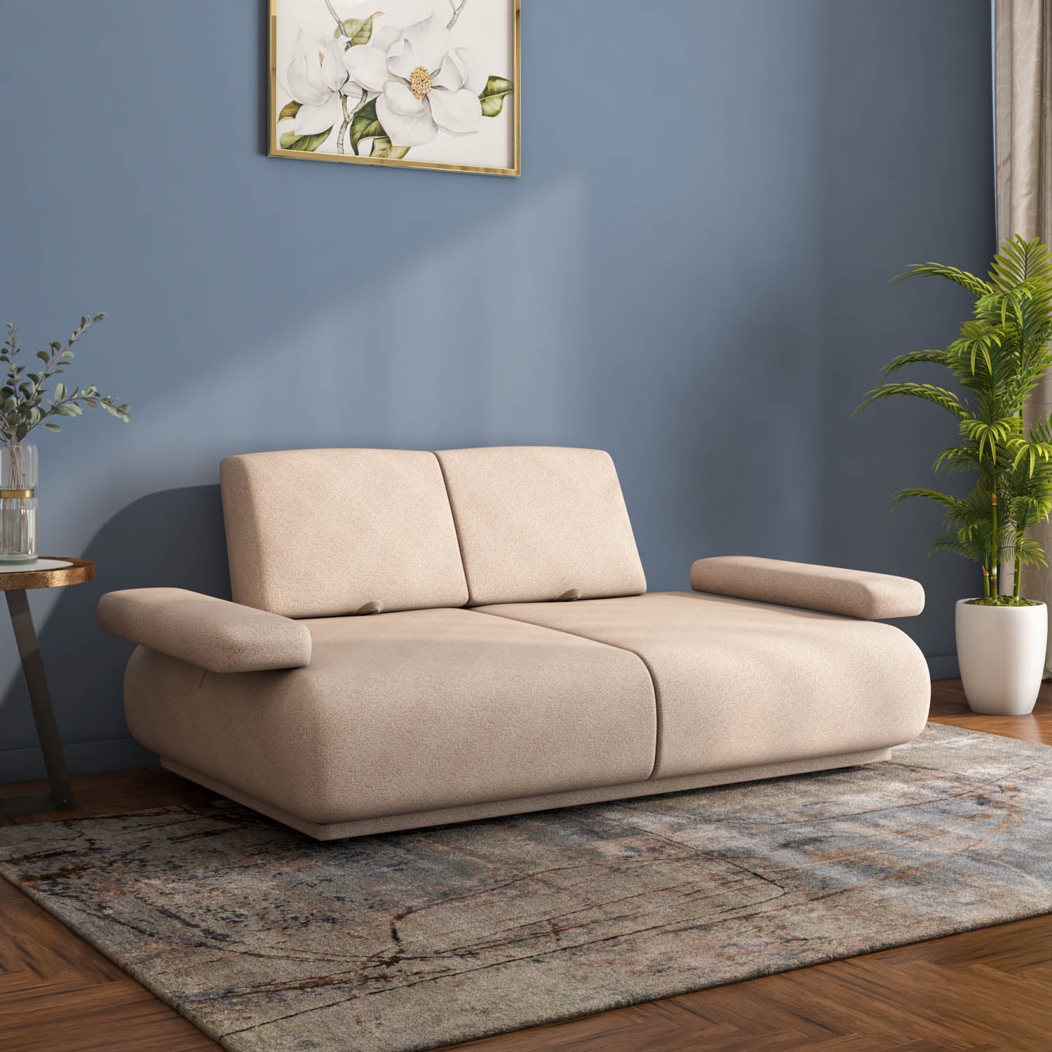 The Nilkamal Homes Fritzi 2-Seater Sofa combines exceptional comfort with versatile functionality. Its smooth mechanism effortlessly pushes back the backrest and arms, converting the sofa into a bed or lounger. The 1.5-inch armrests, cushioned with 23 kg/m³ density foam, provide a relaxing sitting experience. Superior comfort is delivered through multiple layers of foam, pocketed springs, S-springs, and webbing. A fabric pull-back loop ensures the quick and easy return of the backrest to its original position. Built from solid wood and engineered wood, with polyester upholstery and PVC legs, this sofa is designed for lasting durability.
