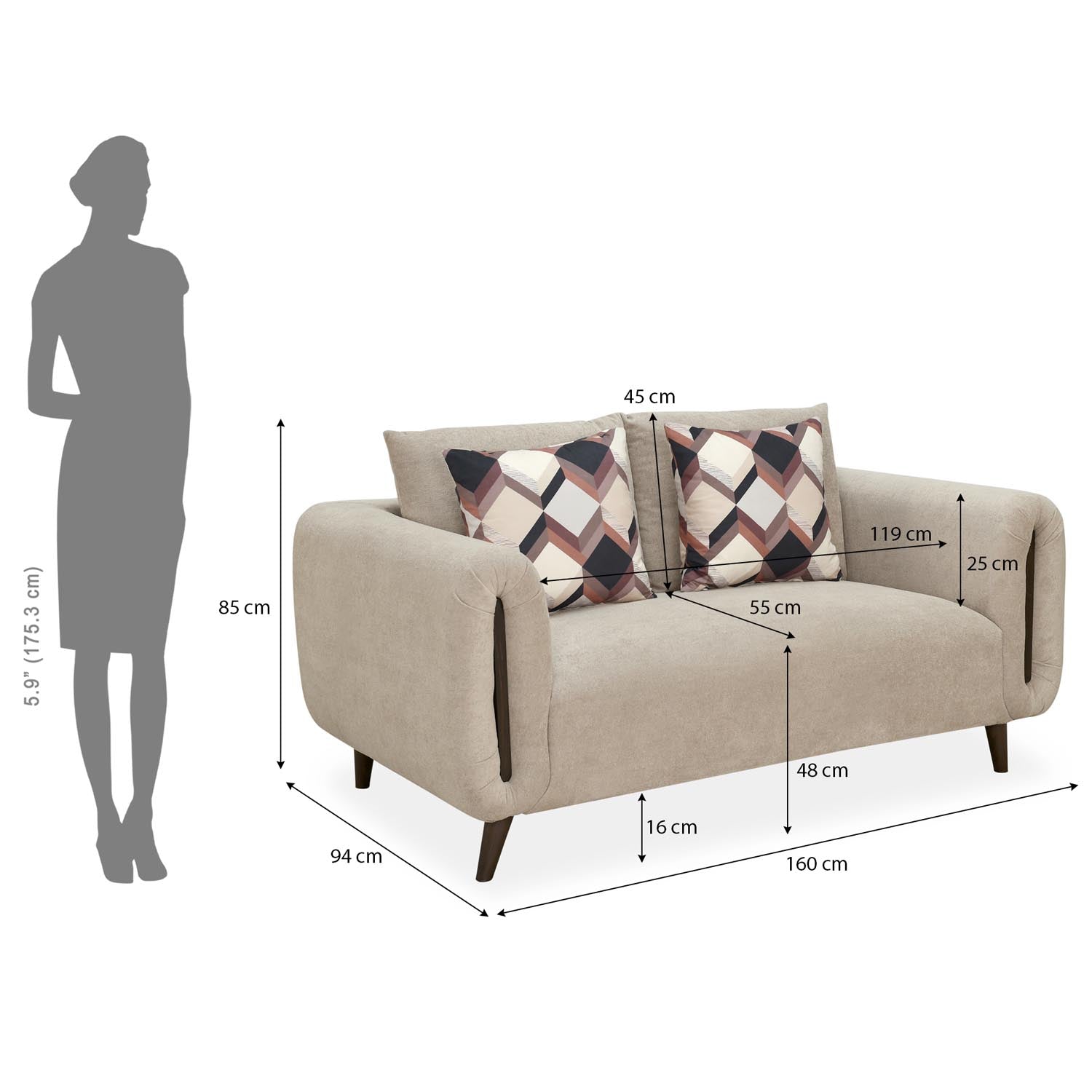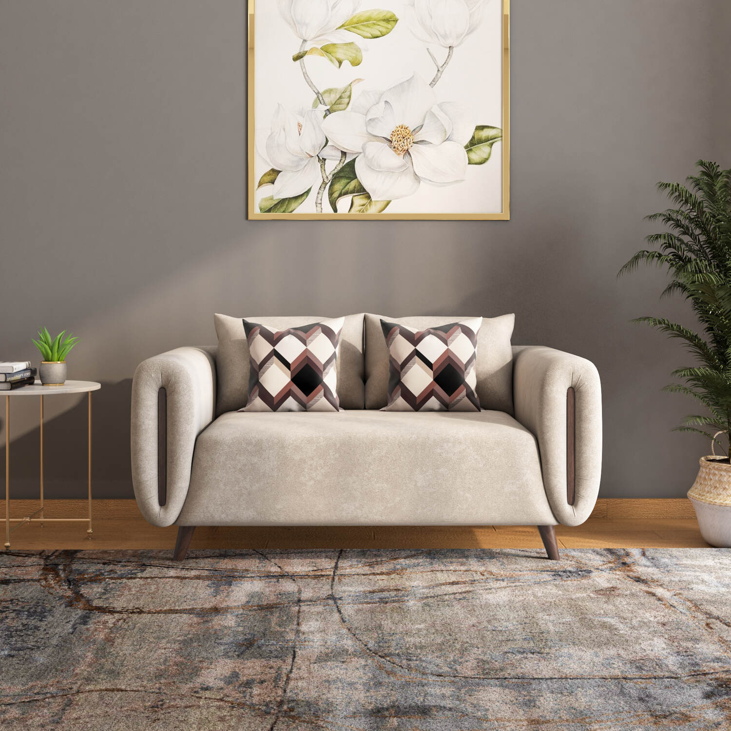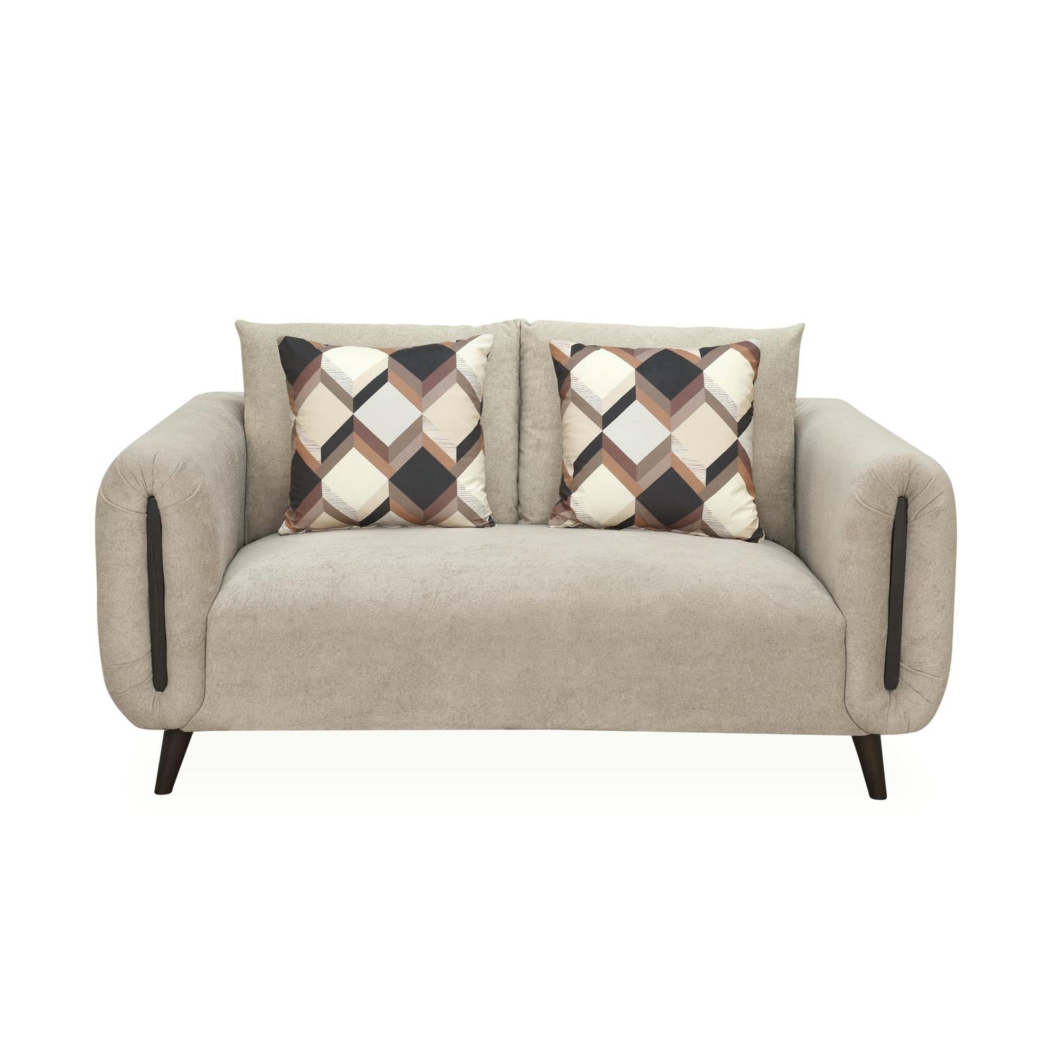 The Nilkamal Homes Harper 2-Seater Sofa brings modern elegance into your space with its warm beige colour and softly curved design, complete with a cushioned backrest that enhances comfort. Upholstered in textured polyester bouclé fabric, it feels cosy and inviting. The armrests curve inward with a central wooden strip, while the PVC legs in wooden finish match the detailing, giving the sofa a balanced and elegant look. A patterned throw cushion adds visual interest, and the structure is crafted from pine wood and engineered wood to ensure long-lasting durability, making the 2-seater perfect for small living rooms, compact lounges, or stylish apartment spaces.
