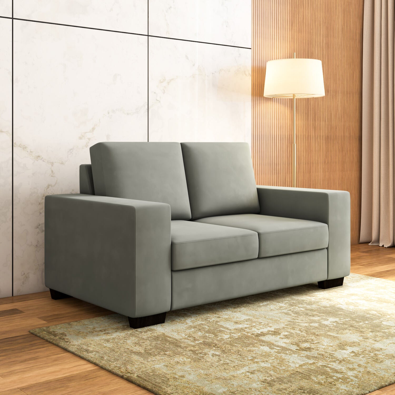 Give your guests a warm welcome with the simplistic yet elegant Shirley sofa from Nilkamal. This opulent two-seater sofa strikes a perfect balance between support and comfort, making long conversations with family and friends all the more enjoyable. Shirley's strength comes from sturdy solid wood and an engineered wood frame at its core, which keeps the sofa firmly in place. The luxurious layers throughout the Shirley Sofa make sitting a relieving and relaxing experience. The seat is supported by a sturdy MDF base, 30-kg foam, and pocket springs to keep the seater comfortable. Its back is just as comfortable, with 28 kg of foam and S springs providing supportive bounce to ease your back. The sophisticated grey-coloured, 270-gsm-soft fabric on top offers a soothing touch that will make you want to stay seated on the couch for a while more. Some homes don't require an extravagant couch; instead, they require a lovely sofa that makes sitting relaxing while adding to the overall beauty of the space. If your home needs such an upgrade, the Shirley 2-Seater Sofa is for you.