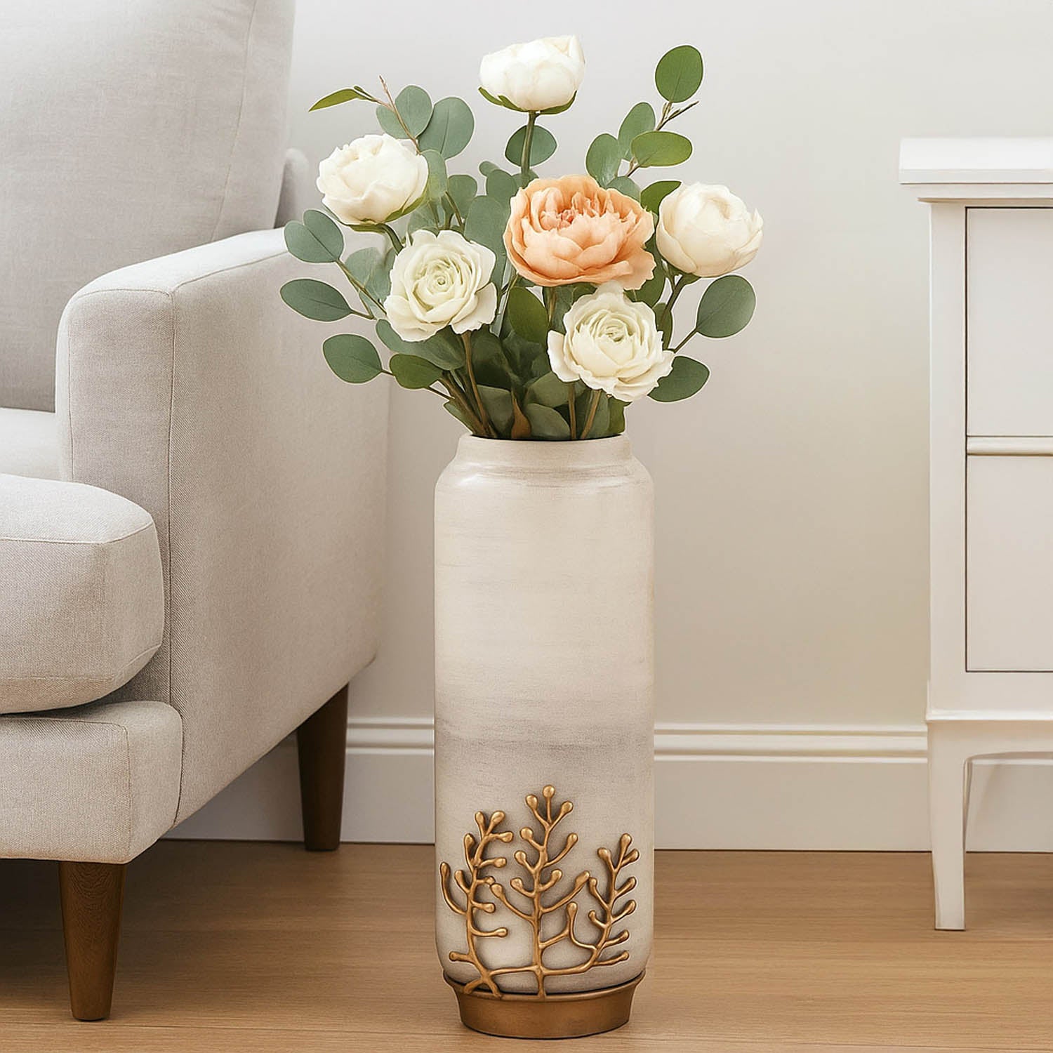 Decorative Tall Floor Vase with Golden Branch- Beige and Gold