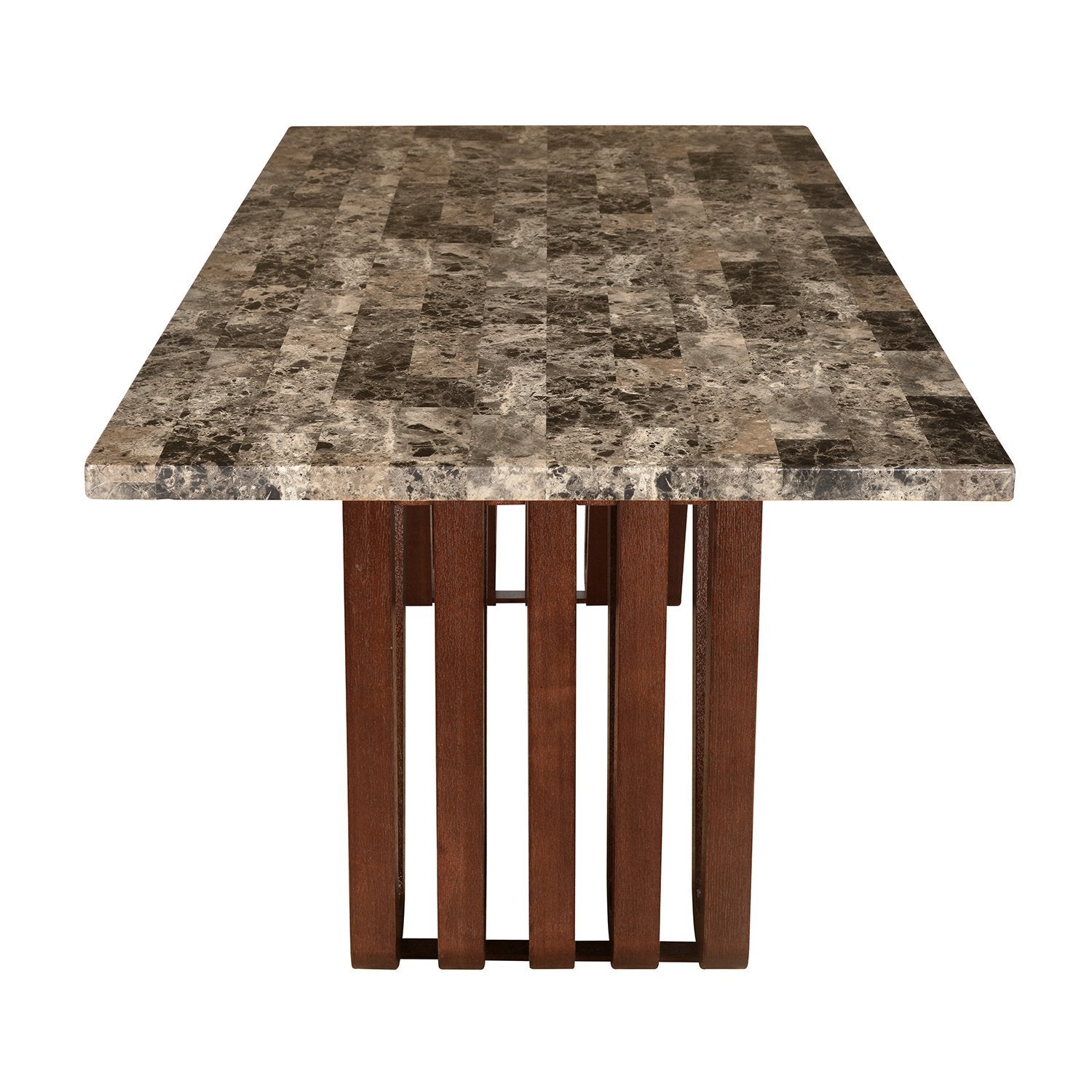 Taking on a contemporary clean-lined silhouette this piece gets a vintage touch with its marble top. A hearty Sunday brunch or upscale dinner party, the Capri 6 seater is happy to be at the center of it all. The table is founded on two solid wooden legs, these keep the table upright while giving it a classy, rich look. The marble top can be cleaned easily with a damp cloth, keeping it looking new and shiny for long. The marble and wood make a great combination that enhance your entire dining island. With its turned legs, and clean rectangular silhouette, this tabletop strikes a smooth finish. The timeless and elegant design of this piece is bound to impress any guests and friends you have come over. It is the perfect addition to elevate style and highlight the décor of your dining and living room. Get this stylish piece of furniture today.