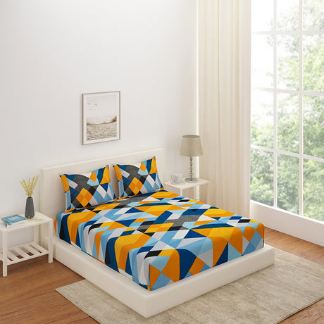 Geometric Microfiber Double Bedsheet with 2 Pillow Covers (Orange & Blue)