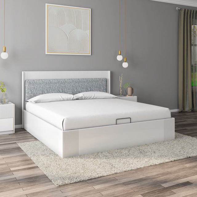 Introducing the Nilkamal Homes Nix Queen Bed, meticulously crafted from engineered wood and adorned with melamine and high gloss PU finish, exuding an aura of refined sophistication. The headboard envelops you in luxury with its plush fabric back cushion, seamlessly blending comfort with style. A sturdy iron mild steel mattress panel ensures unwavering support, promising nights of undisturbed rest. Beneath, a hydraulic mechanism storage with four compartments keeps your belongings neatly organised and easily accessible, optimising bedroom space with effortless grace. Adding to its allure, the bed boasts a modern fluted design on both the headboard and footboard, epitomising contemporary elegance and elevating your bedroom's aesthetic to new heights.