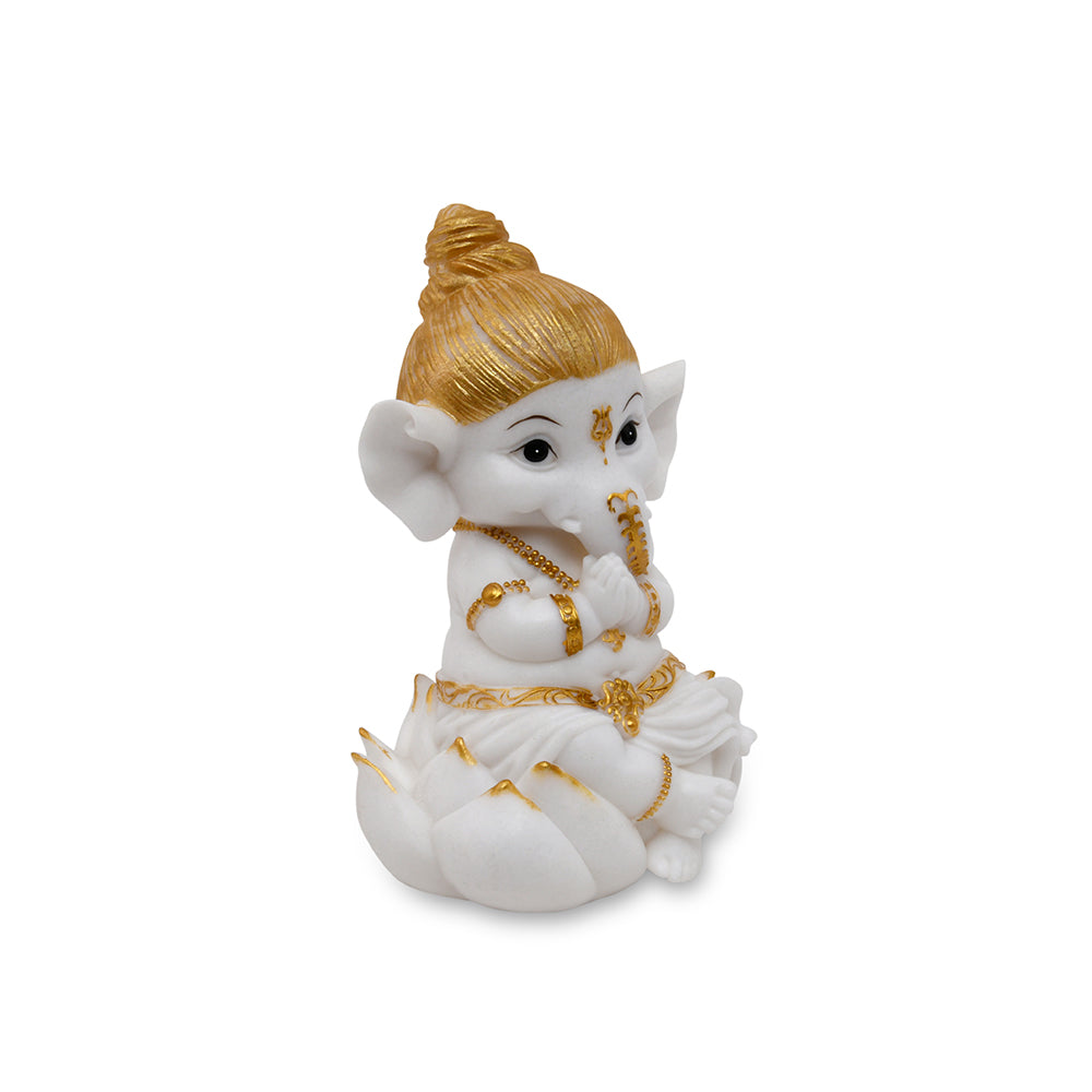 Ganesha On Lotus Decorative Polyresin Showpiece (White & Gold)