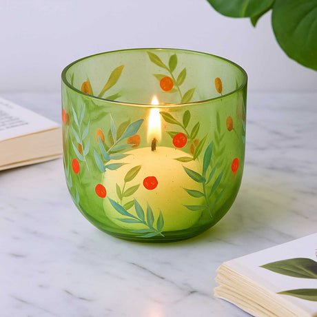 Hand-Painted Leaf Design Glass Votive Candle Stand- Green