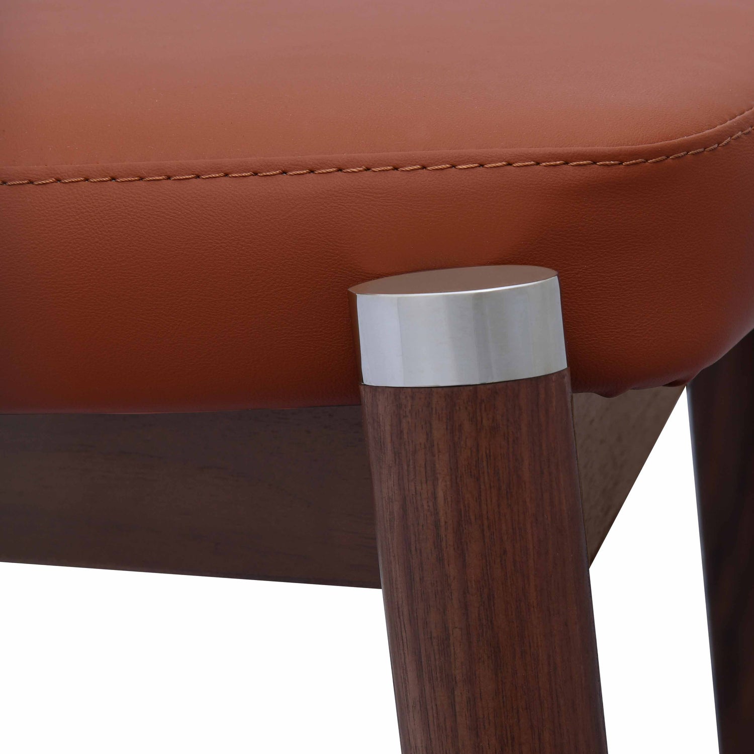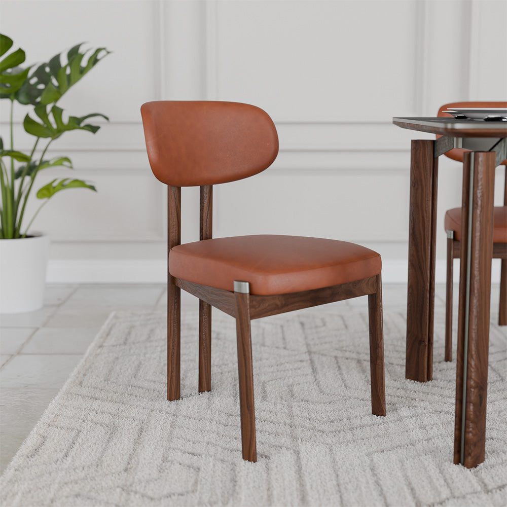 The Nilkamal Homes Trinity Dining Chair features a robust construction of American Walnut Wood, providing both durability and a touch of elegance. Its angled backrest ensures maximum comfort during extended periods of sitting, while metal tips on the chair legs end add durability and protect your floors. The chair is upholstered in high-quality soft PVC, offering a luxurious feel and easy maintenance. Perfect for any dining setting, it combines style and comfort seamlessly.