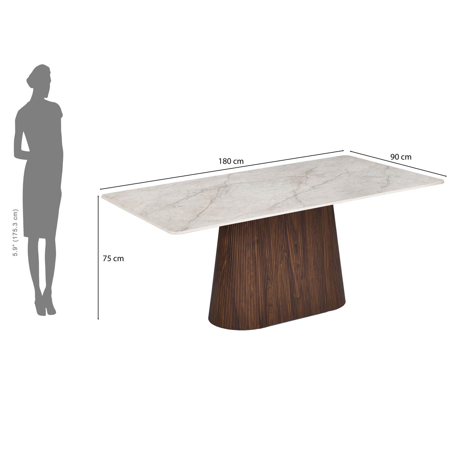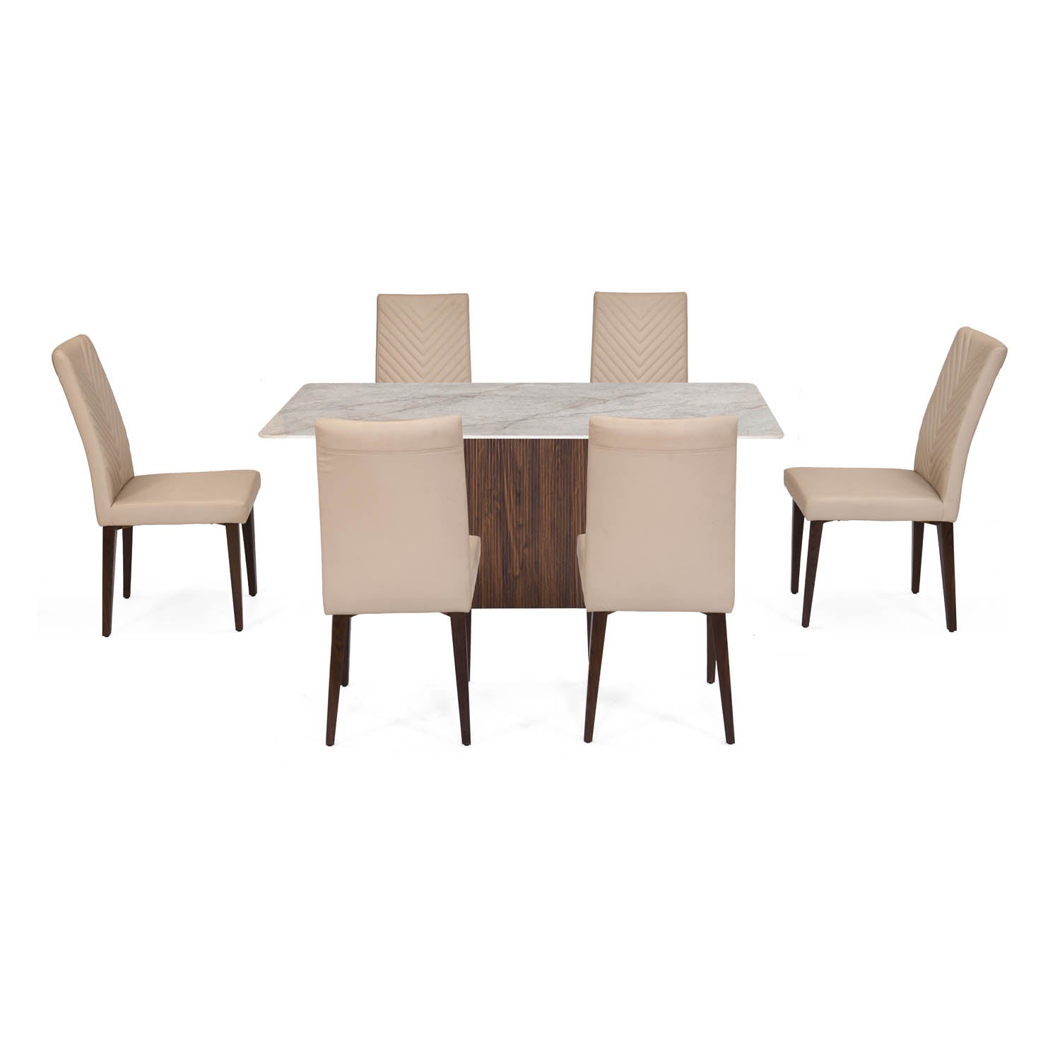 Refresh your dining space with this Flinda Bevon 6-Seater Dining Table, designed to strike the perfect balance between modern elegance and everyday comfort. The ceramic tabletop in a soft beige finish blends seamlessly with any décor. It features a heat, scratch, and stain-resistant surface that stays beautiful with minimal care. Its pyramid-shaped base with fluted detailing adds a stylish architectural touch while ensuring excellent stability, supported by durable engineered wood for long-lasting strength. The chairs are upholstered in soft leatherette for a luxurious feel and easy maintenance, and feature chic chevron quilting on the backrest that adds a designer element and ergonomic support. Powder‑coated metal legs provide reliable durability, making this set ideal for family meals, guest gatherings, or creating a warm and inviting dining experience in contemporary homes or apartments.