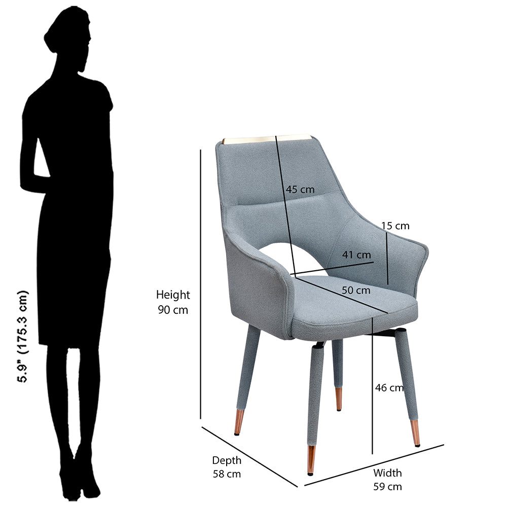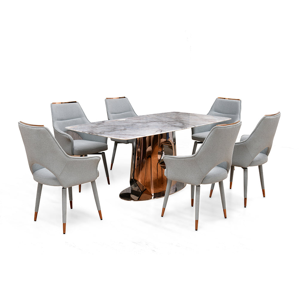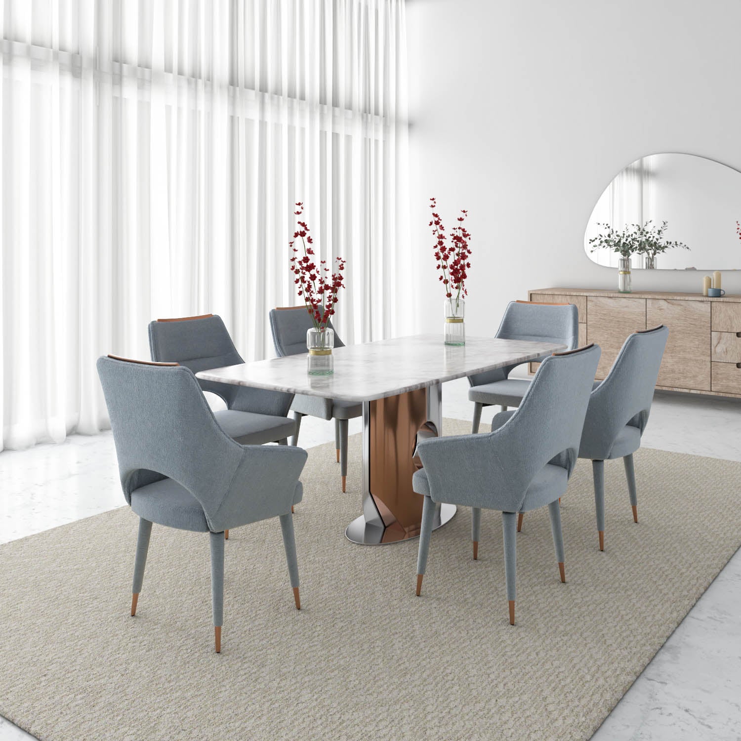 Experience dining in style with the Nilkamal Homes Cordelia 6-Seater Dining Set, featuring a stunning crystal blue marble top accented with natural grain patterns. The rose gold and silver stainless steel pedestal base brings a contemporary edge, creating a standout centrepiece for your dining room. Each chair in the set combines comfort and style with a chic, curved backrest and an auto-return swivel mechanism, ensuring a seamless dining experience. This spacious 6-seater design is crafted to bring stability and elegance, making it ideal for memorable gatherings with friends and family.