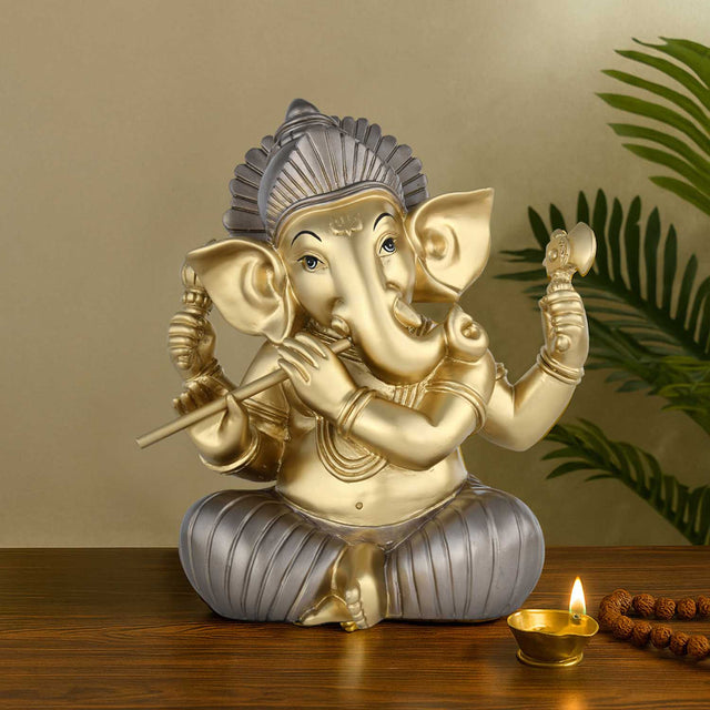 Ganesha Playing Flute Decorative Polyresin Showpiece- Grey and Gold