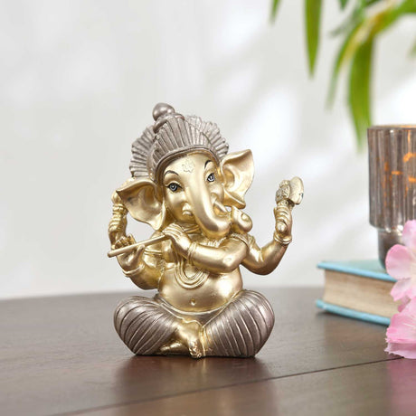 In-store ExclusiveGanesha Playing Flute Decorative Polyresin Showpiece- Gold and Silver