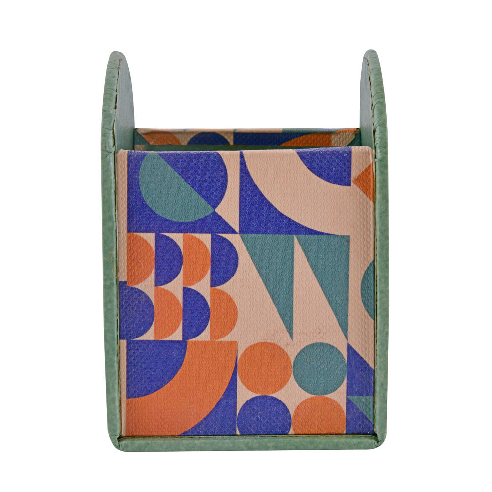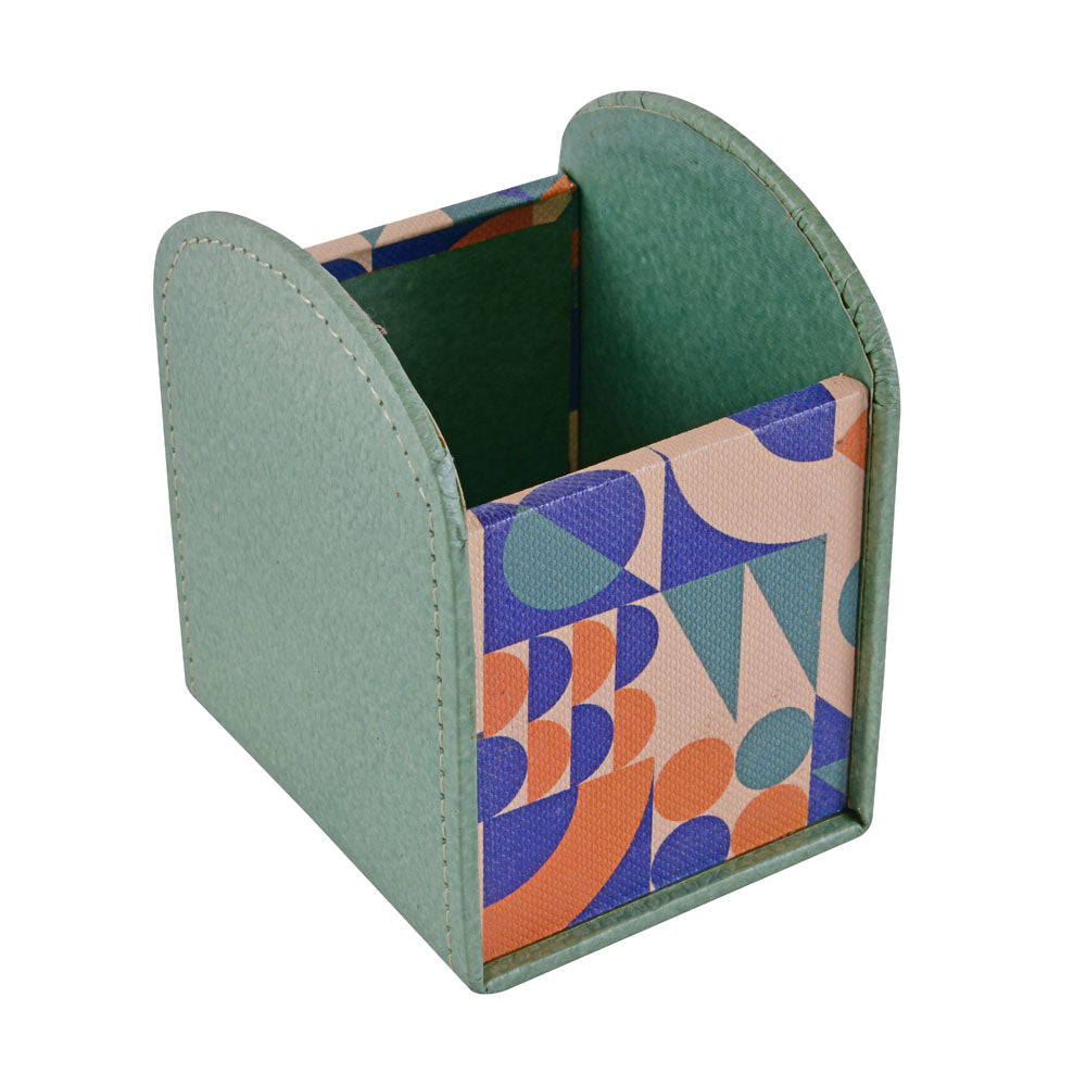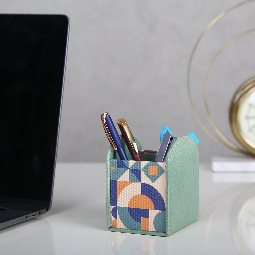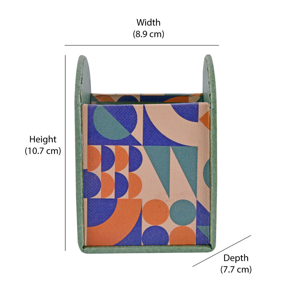 The Nilkamal Homes Utility Stand features an arch shape with distinct sides—two plain green and the other two patterned in an abstract design—bringing both functionality and a splash of colour to your space. Crafted from durable leatherette, cardboard, and MDF, it offers lasting strength while remaining lightweight and easy to move. This versatile stand accommodates a range of items, from pens and pencils to small office supplies, keeping everything organized. Its compact size fits perfectly on desks of all dimensions, maximizing space without sacrificing organization. With easy access to your writing tools, this utility stand enhances productivity and keeps your workspace tidy.