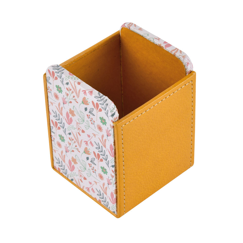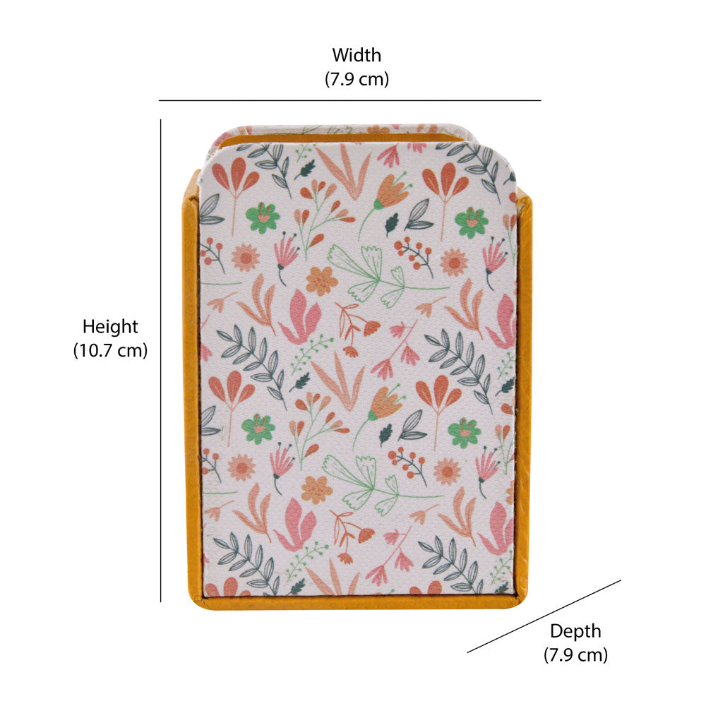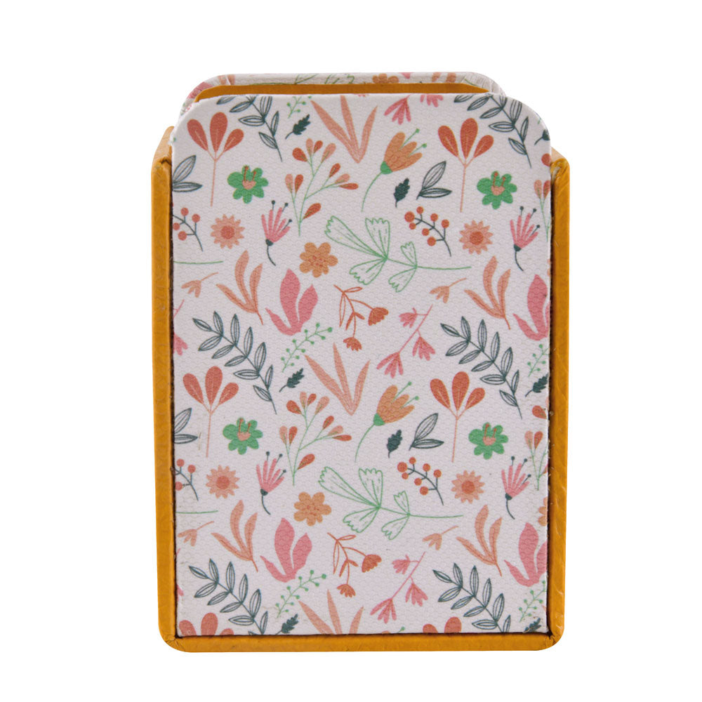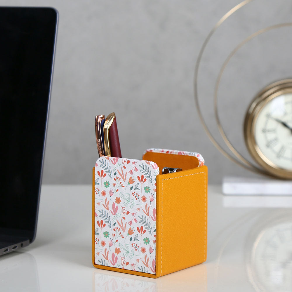 The Nilkamal Homes Utility Stand features an arch shape with distinct sides—two plain yellow and the other two patterned in a floral design—bringing both functionality and a splash of colour to your space. Crafted from durable leatherette, cardboard, and MDF, it offers lasting strength while remaining lightweight and easy to move. This versatile stand accommodates a range of items, from pens and pencils to small office supplies, keeping everything organized. Its compact size fits perfectly on desks of all dimensions, maximizing space without sacrificing organization. With easy access to your writing tools, this utility stand enhances productivity and keeps your workspace tidy.