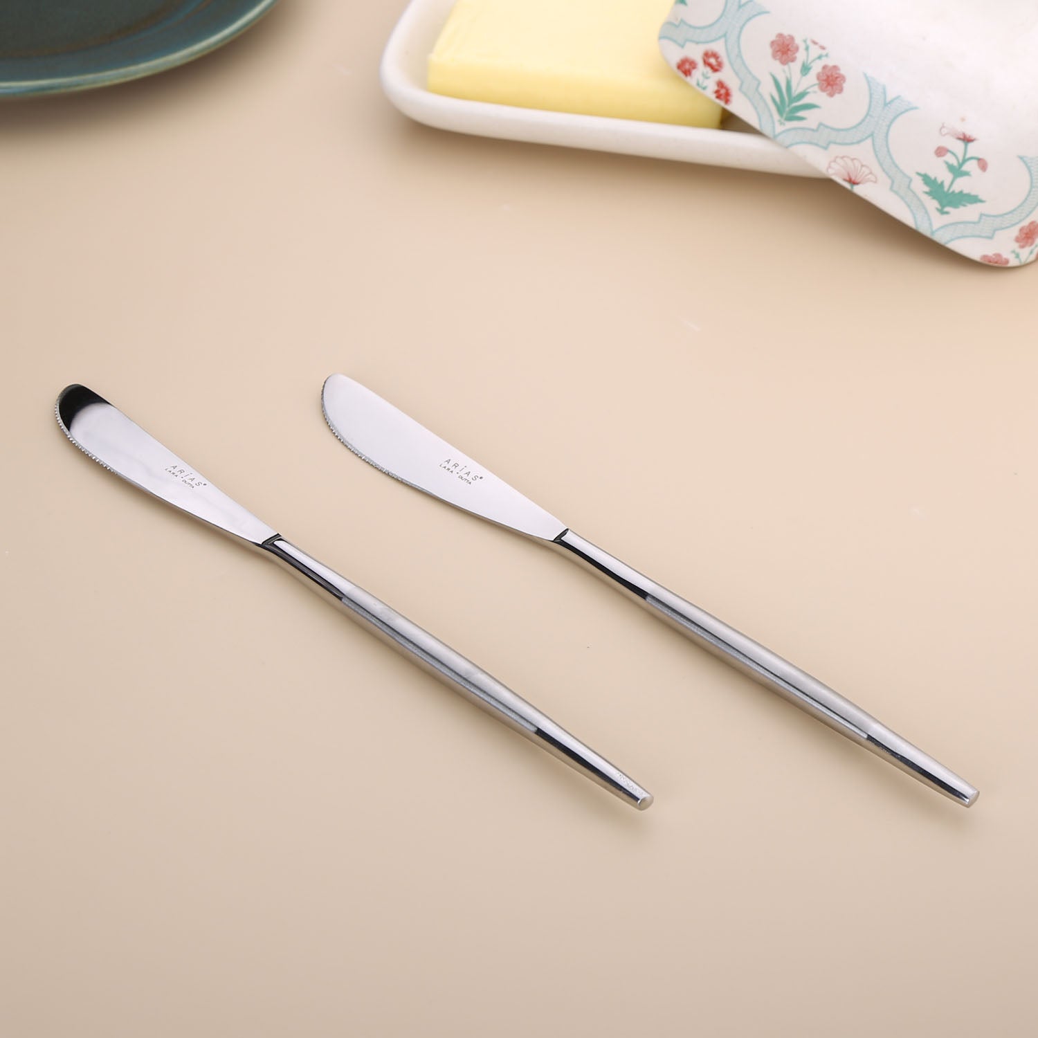 The Arias by Lara Dutta Knife Set of 2 from Nilkamal Homes combines style and functionality, making it a must-have addition to your dining table. The butter knives, with their premium stainless steel build and exquisite canary design, offer durability and a touch of elegance. Their defined edges ensure safe and precise spreading, while the ergonomic handles provide a comfortable grip for effortless use. Whether you're spreading butter, jams, or soft cheeses, these knives are versatile and perfect for daily use and special occasions. Upgrade your dining experience with this chic and practical set!