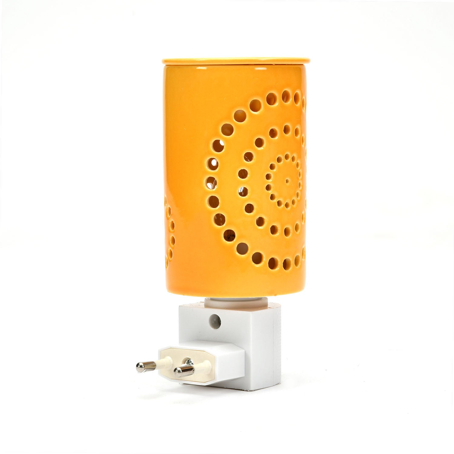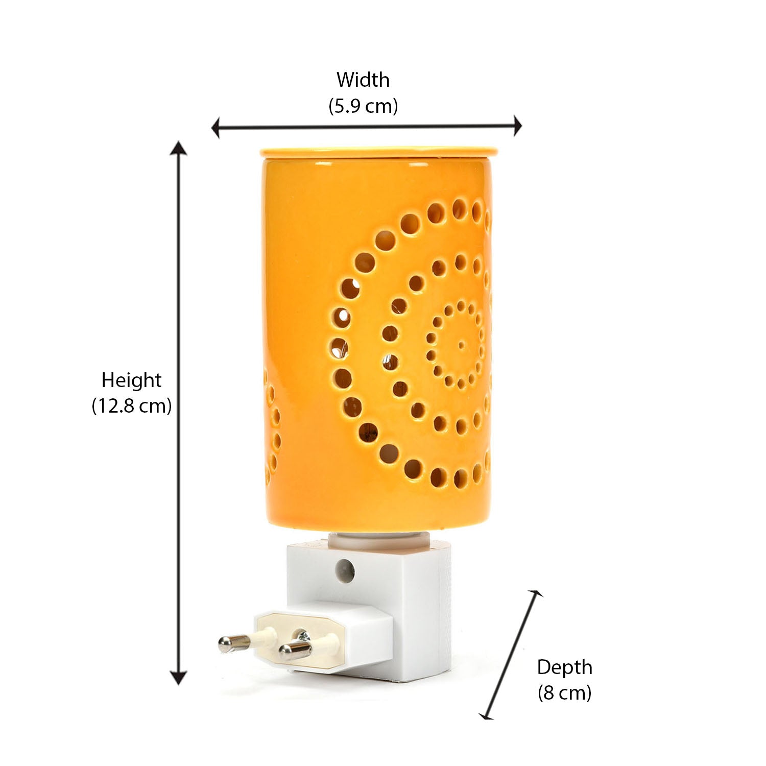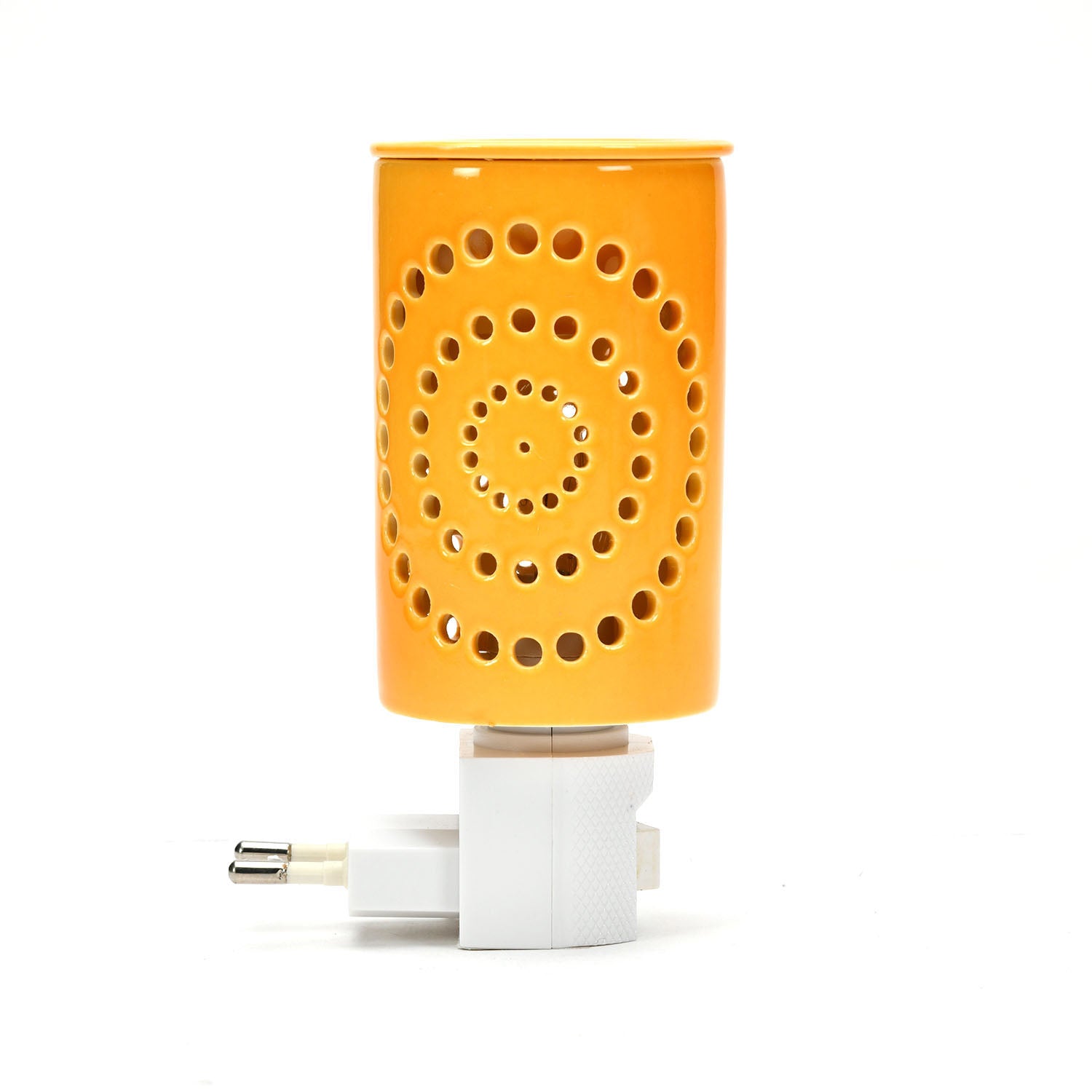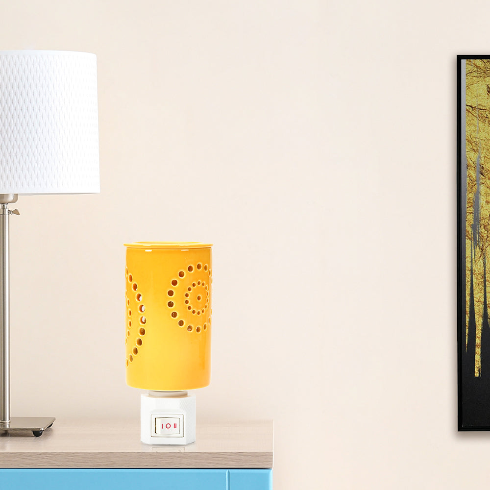 Warm up your ambience with mood lighting, a shadow effect, and a pleasant aroma with the Cylindric Electric Diffuser. This elegantly electric plugin diffuser, made from porcelain, has patterned cutouts in a lively mustard colour that lends an aesthetic appeal to the diffuser. When turned on, the bulb inside the diffuser casts a shadow on your room for a mesmerizing effect. You can enhance this welcoming feel by adding aroma oils or wax melts to the diffuser top. So this Cylindric Electric Diffuser elevates your home with warm lighting and soothing aromatherapy, making it ideal for meditation, yoga, and relaxation. If you want your home, office, or spa to feel peaceful, this plugin diffuser is for you.