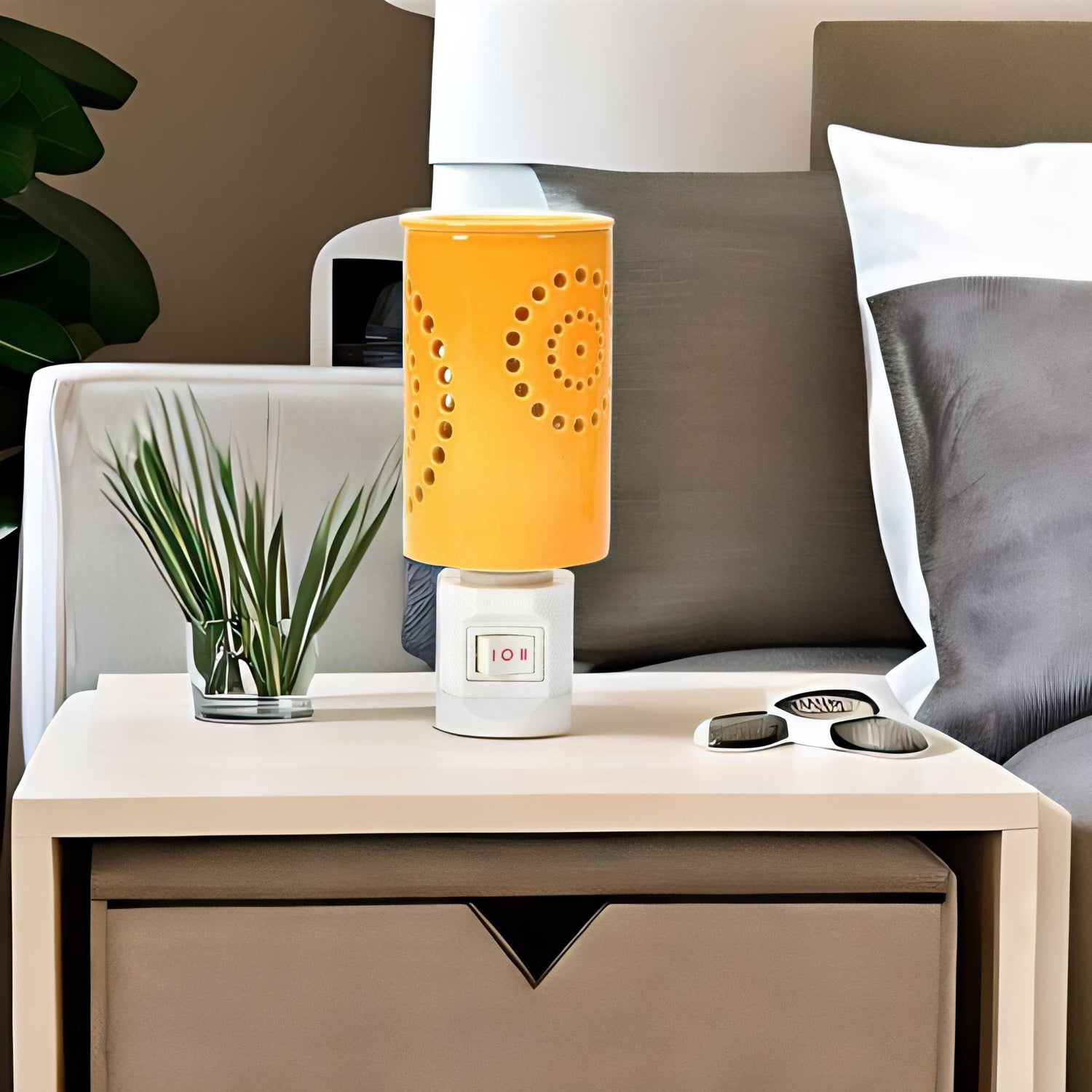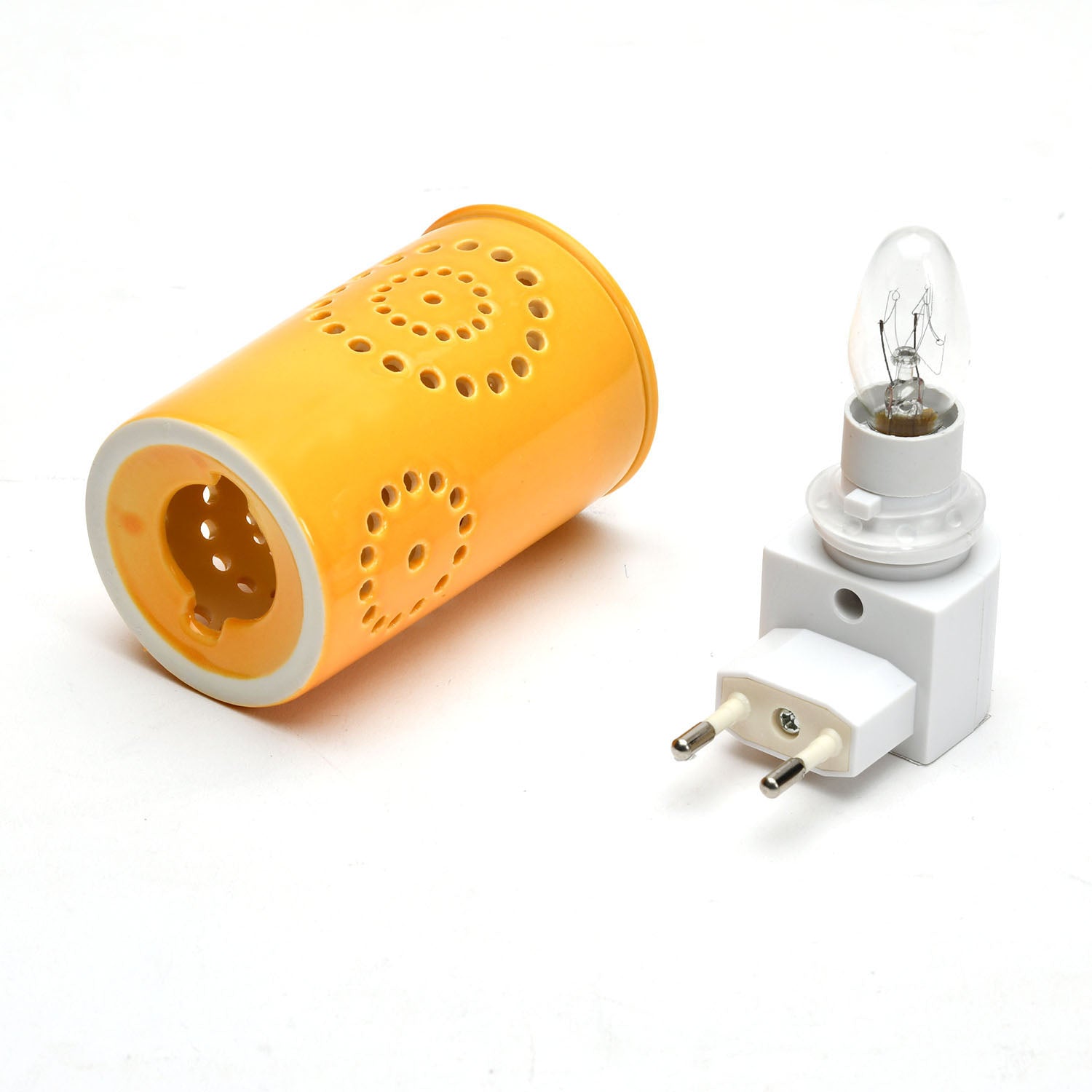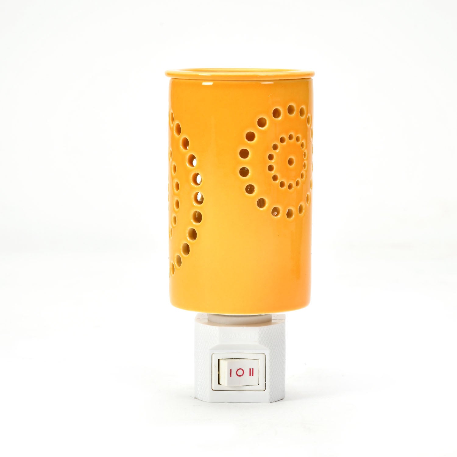 Warm up your ambience with mood lighting, a shadow effect, and a pleasant aroma with the Cylindric Electric Diffuser. This elegantly electric plugin diffuser, made from porcelain, has patterned cutouts in a lively mustard colour that lends an aesthetic appeal to the diffuser. When turned on, the bulb inside the diffuser casts a shadow on your room for a mesmerizing effect. You can enhance this welcoming feel by adding aroma oils or wax melts to the diffuser top. So this Cylindric Electric Diffuser elevates your home with warm lighting and soothing aromatherapy, making it ideal for meditation, yoga, and relaxation. If you want your home, office, or spa to feel peaceful, this plugin diffuser is for you.