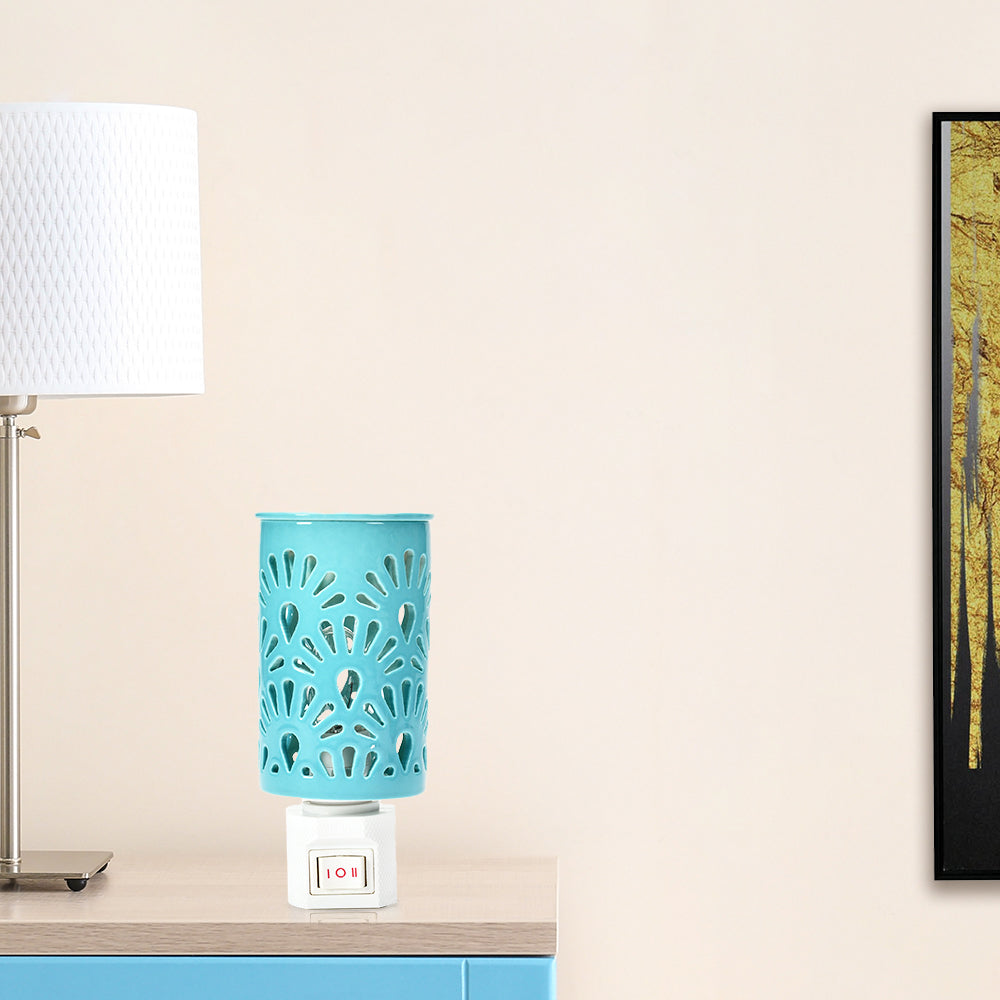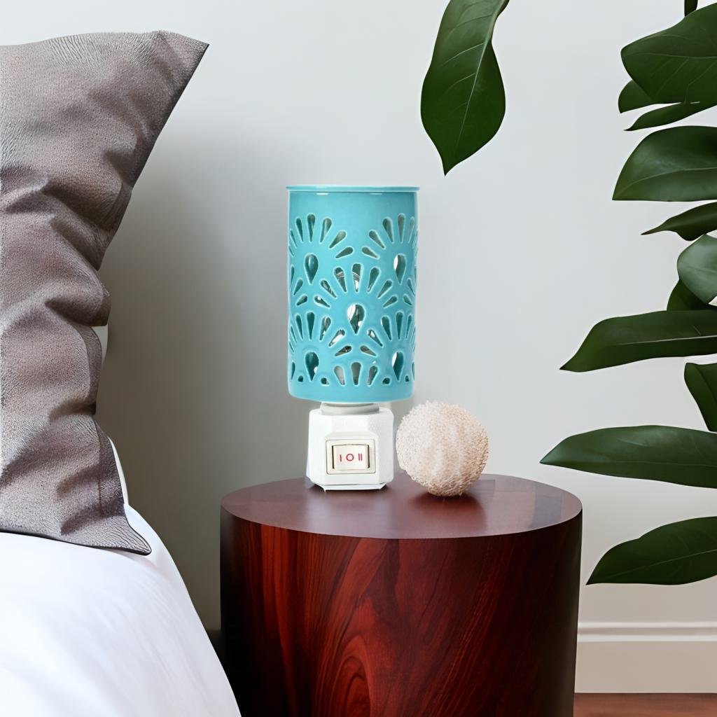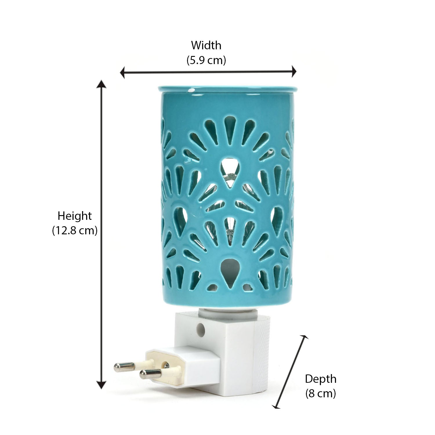 Warm up your ambience with mood lighting, a shadow effect, and a pleasant aroma with the Cylindric Electric Diffuser. This elegantly electric plugin diffuser, made from porcelain, has patterned cutouts in a serene sea-green colour that lends an aesthetic appeal to the diffuser. When turned on, the bulb inside the diffuser casts a shadow on your room for a mesmerizing effect. You can enhance this welcoming feel by adding aroma oils or wax melts to the diffuser top. So this Cylindric Electric Diffuser elevates your home with warm lighting and soothing aromatherapy, making it ideal for meditation, yoga, and relaxation. If you want your home, office, or spa to feel peaceful, this plugin diffuser is for you.