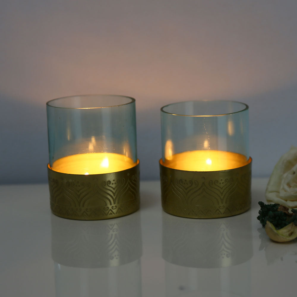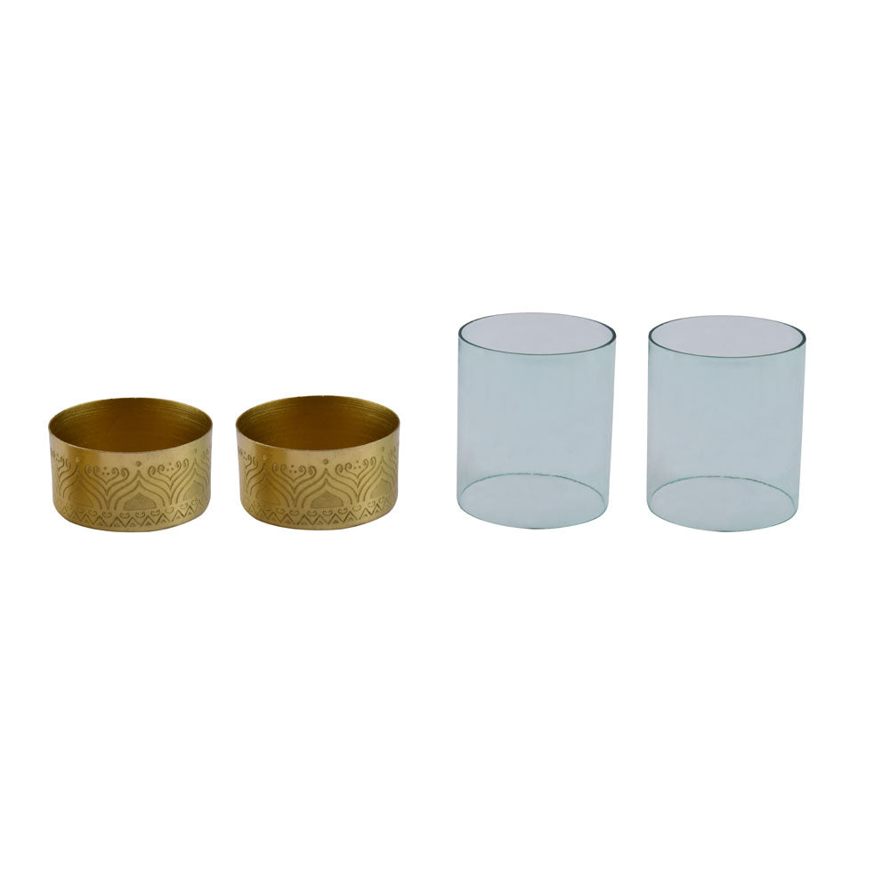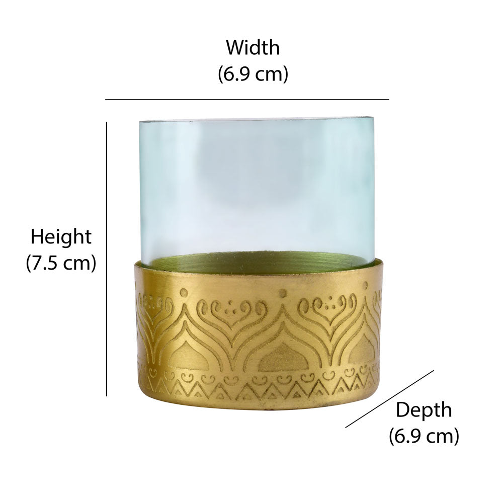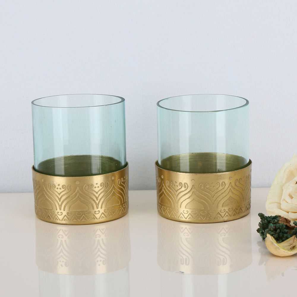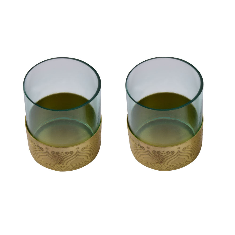 Decorative Metal & Glass Votive Set of 2 (Green & Gold)