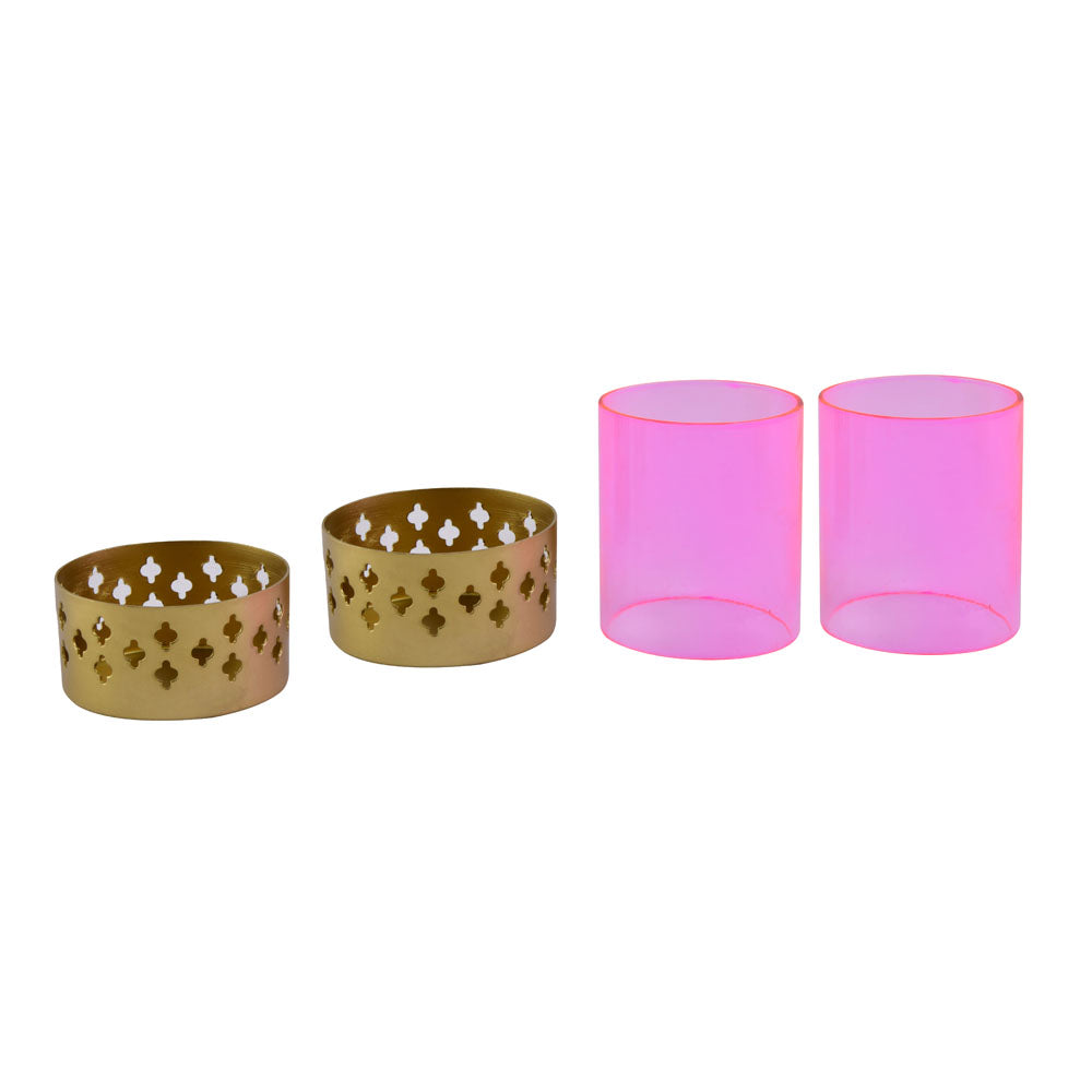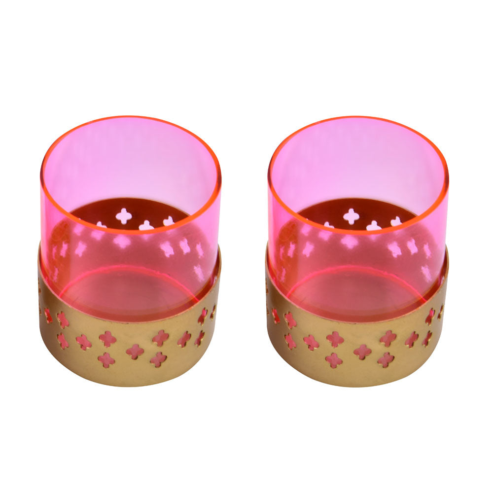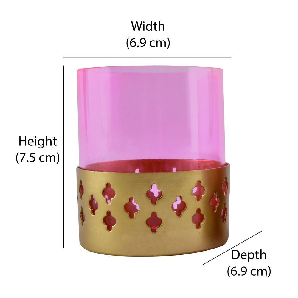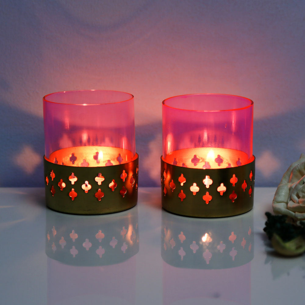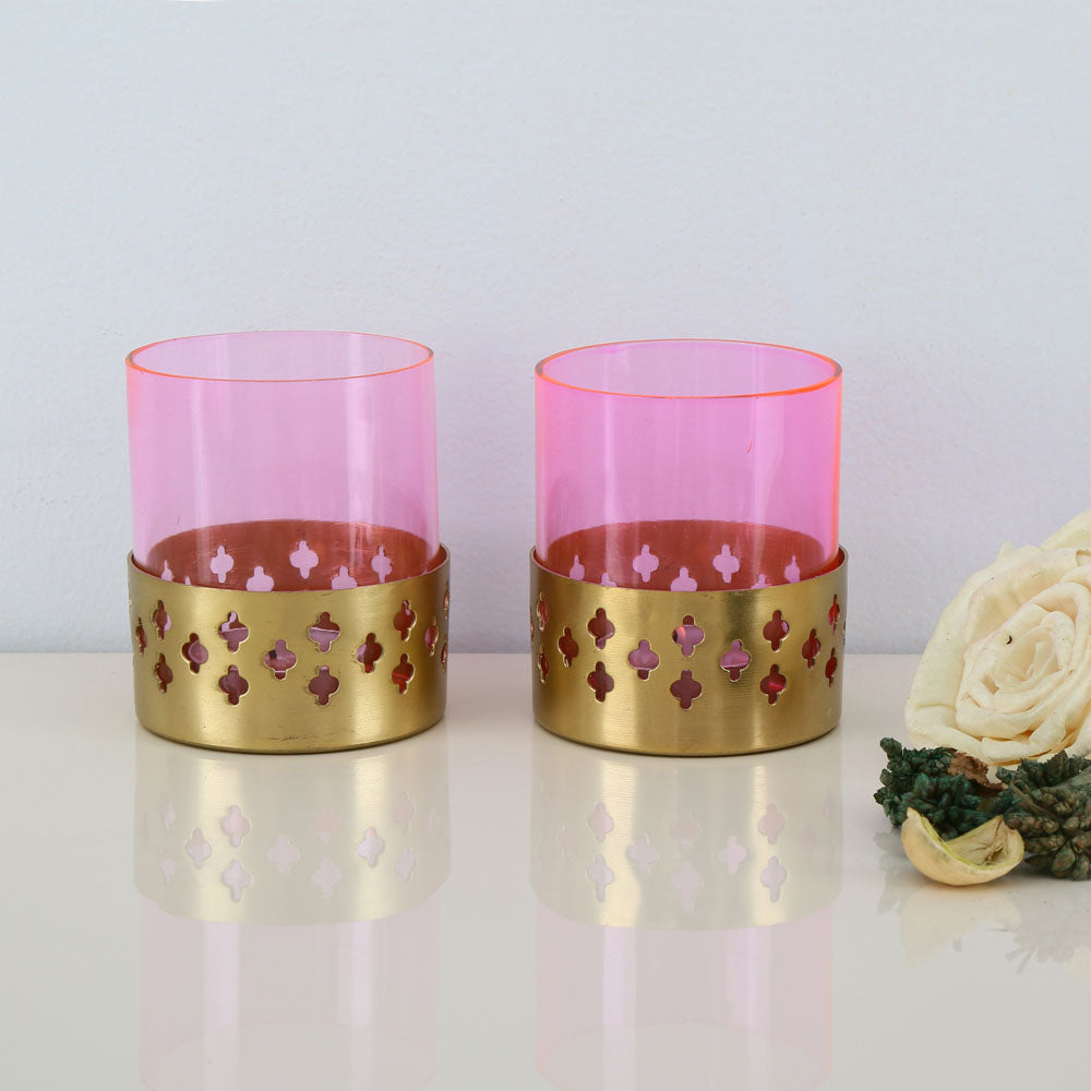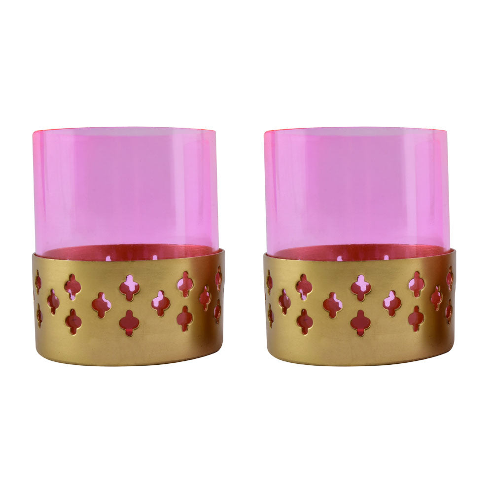 Decorative Mughal Jali Metal & Glass Votive Set of 2 (Pink & Gold)