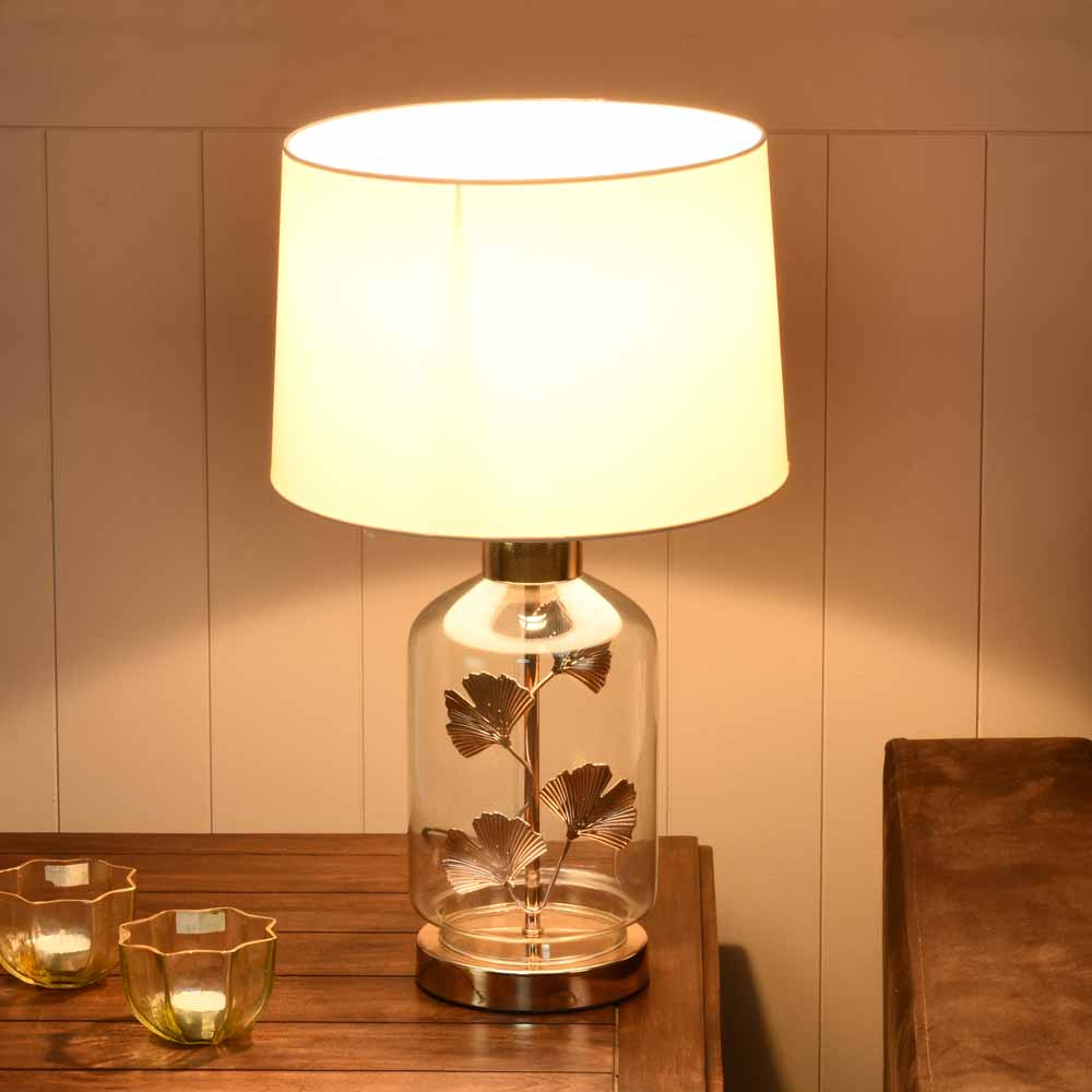 The Nilkamal Homes Glassio Table Lamp boasts a modern aesthetic with its glass, metal and fabric build, providing a stylish touch to any space. Its sturdy and heavy-duty base ensures durability, while the long wire with convenient on/off functionality adds practicality to the design. This versatile lamp finds a home in various settings, from bedrooms and living rooms to offices, kids' rooms, or college dorms. Beyond its illuminating function, it goes the extra mile by enhancing room decor with charming ginkgo accents, making it an ideal choice for style and functionality.