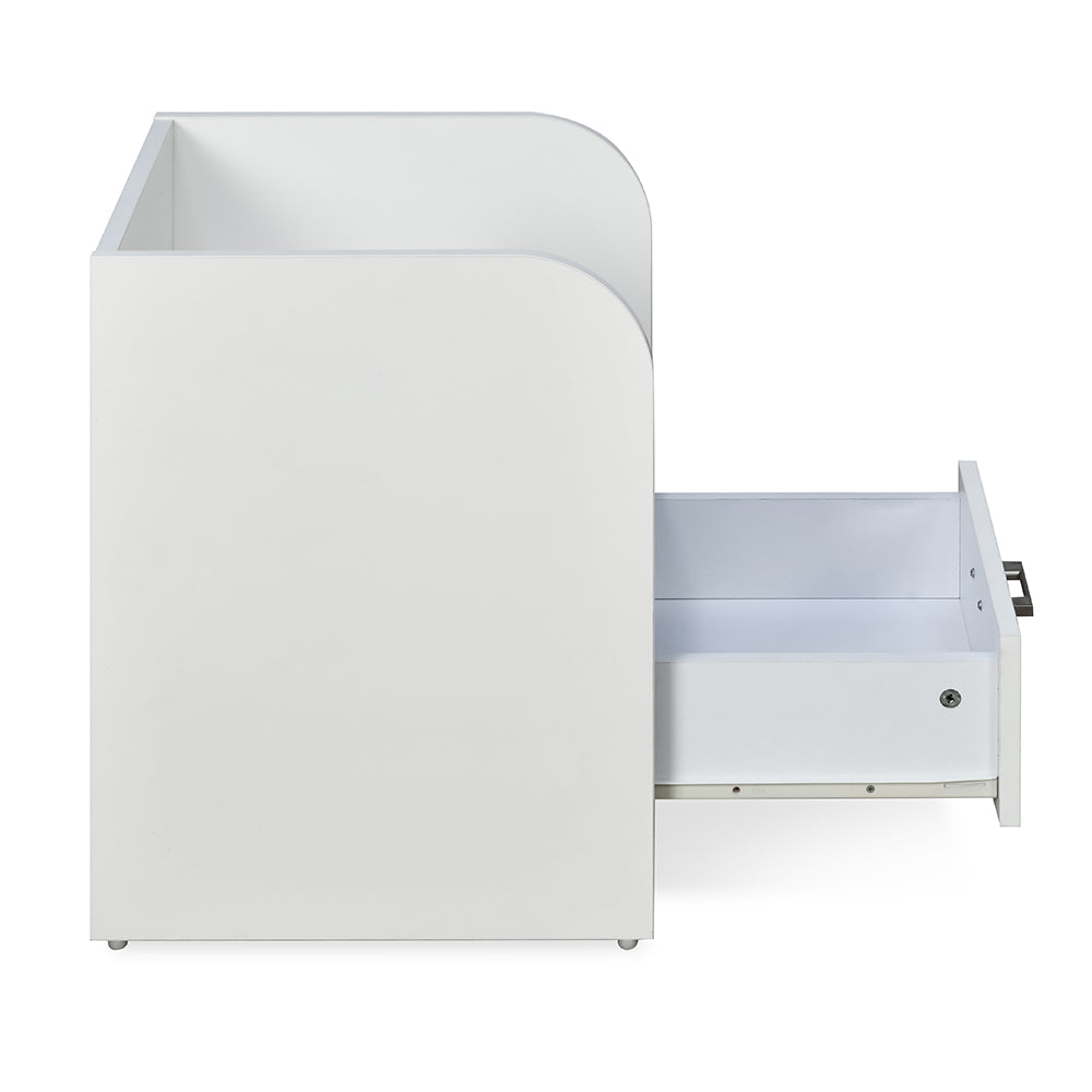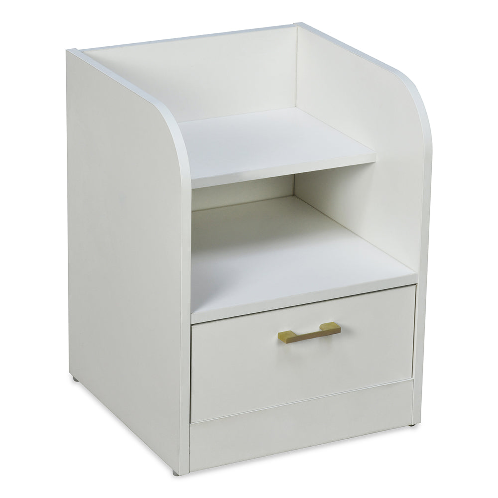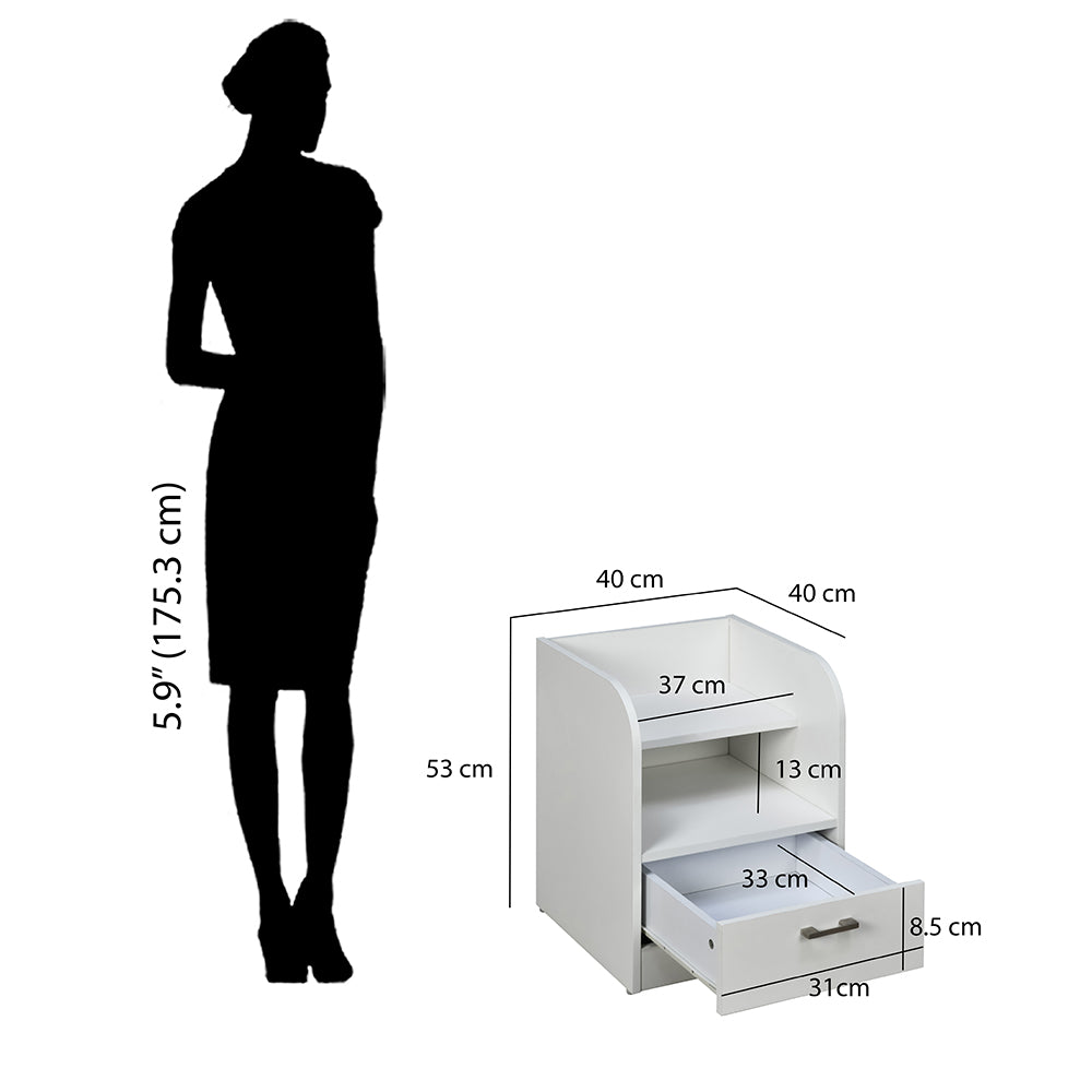 Make your bedside space functional and aesthetically pleasing with the Max Nightstand. This particle board piece by Nilkamal is the perfect bedroom accessory to store your belongings. It comprises two shelves and a spacious drawer. The top shelf of this nightstand can house your lamp or an alarm clock that you may need during the night and the bottom shelf to hold your books. The drawer is installed with nylon slides for smooth movement and can store medicines or eyeglasses to make them easily accessible. Even in matters of look, it does not disappoint. In a frosty white colour, this nightstand offers a modern design that you can pair with any interior. Stay in the comfort of your bed and keep your essentials close at hand with the Max Nightstand.