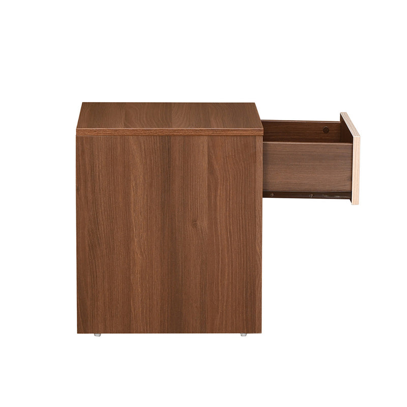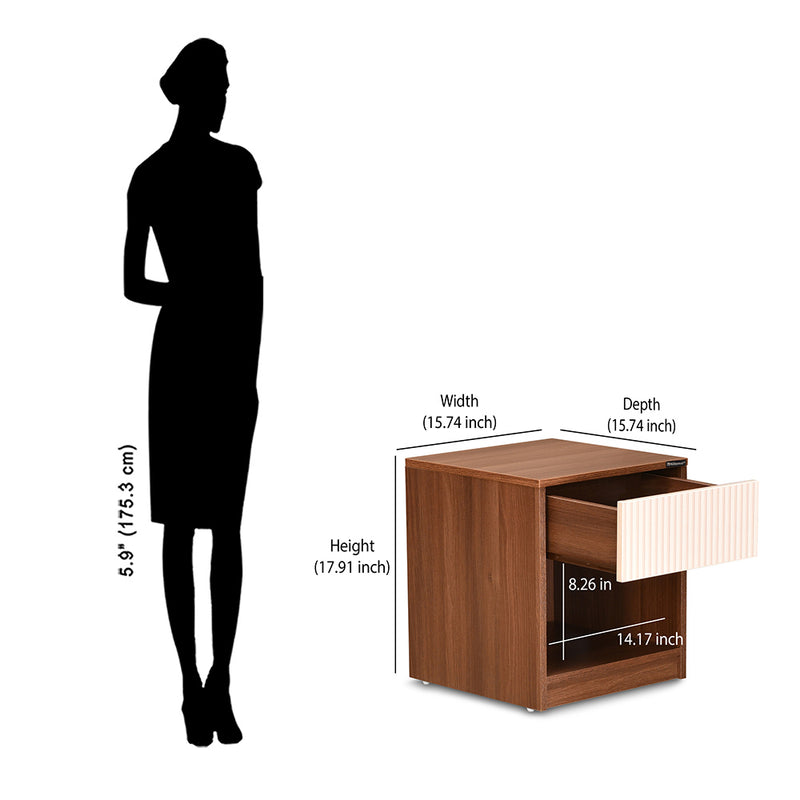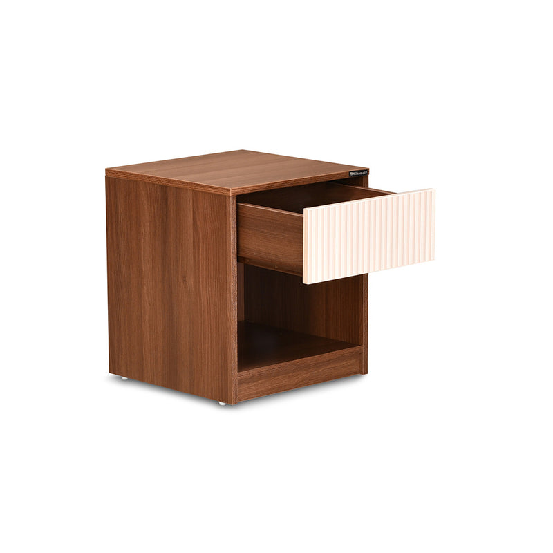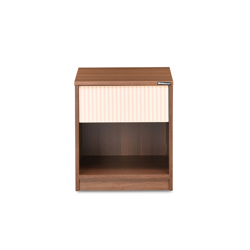 The Nilkamal Rova Night Stand is meticulously crafted from robust engineered wood and showcases a distinctive flute design on the front panel, elevating the visual appeal of your bedroom. This nightstand offers generous storage space for your nightly essentials, featuring a single drawer and a convenient bottom shelf. Its top shelf functions as a practical spot for keeping items like an alarm clock, phone, or a glass of water easily accessible. Moreover, the melamine finish enhances its aesthetics and ensures protection, maintaining its attractive appearance.