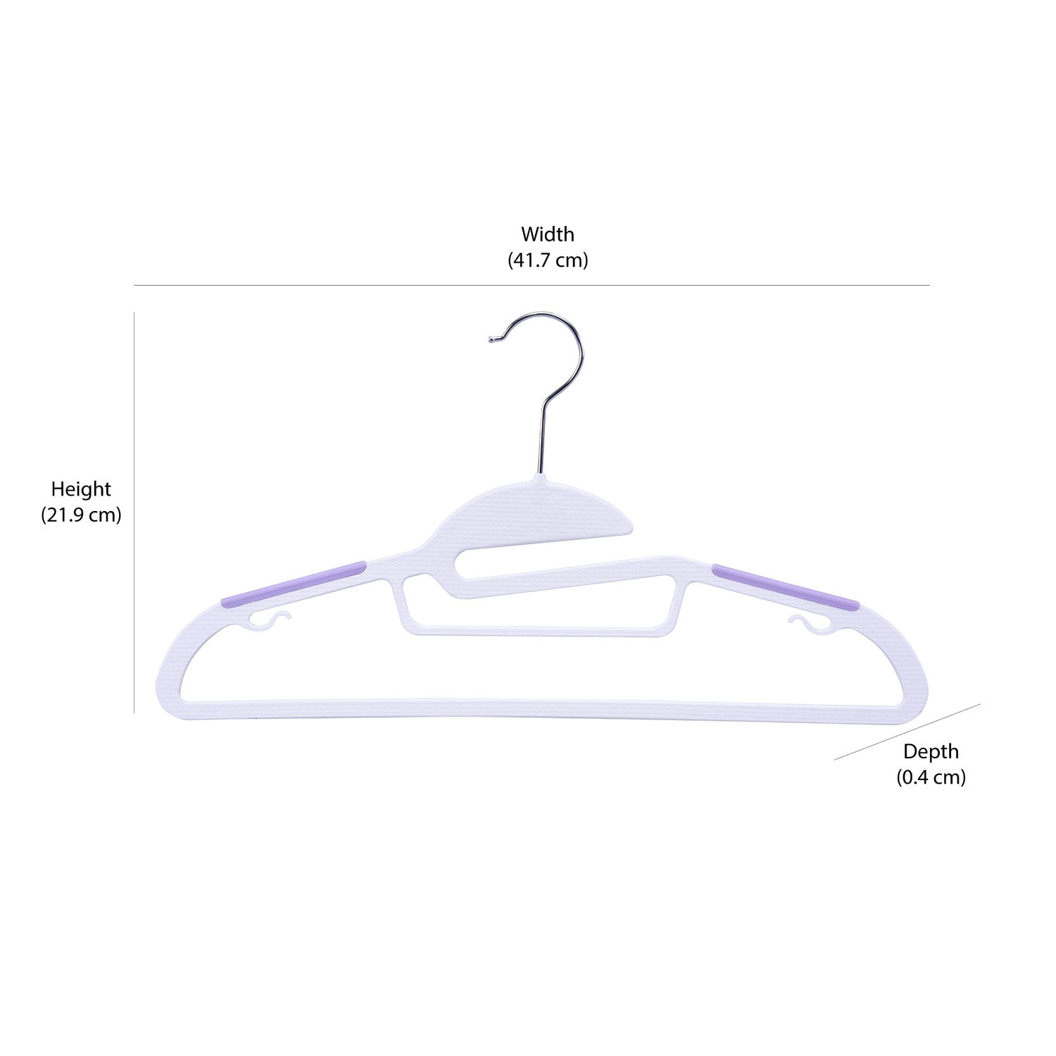 Add versatility to your wardrobe with this Nilkamal Homes set of 10 lavender hangers. These durable hangers feature a construction made from materials like PET, TPE, and metal, ensuring they last for a long time. They also feature non-slip bands, tie holders, and hooks for strapped garments, making them a complete solution for all your clothing needs.