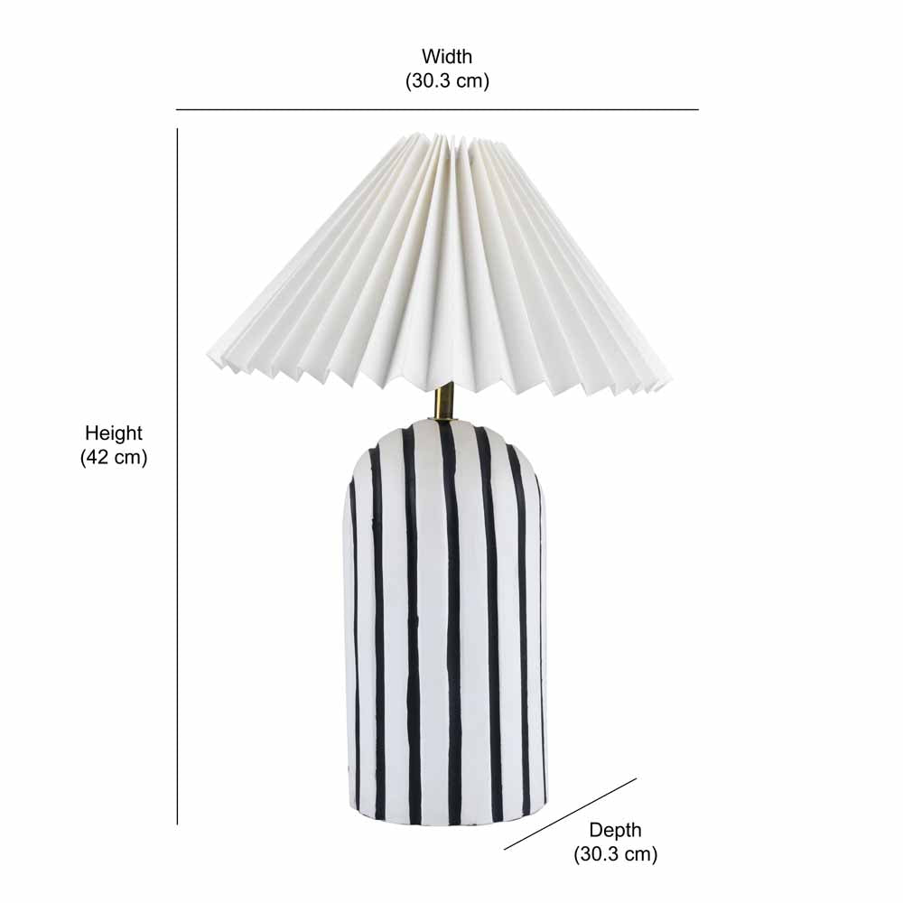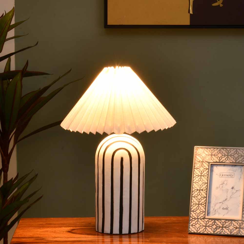 The Nilkamal Homes Retro Table Lamp boasts a modern aesthetic with its paper mache, cotton pleated shade, iron build, providing a stylish touch to any space. Its intricately designed, heavy-duty base ensures durability, while the long wire with convenient on/off functionality adds practicality to the design. This versatile lamp finds a home in various settings, from bedrooms and living rooms to offices, kids' rooms, or college dorms. Beyond its illuminating function, it goes the extra mile by enhancing your room decor with charming style and utility.