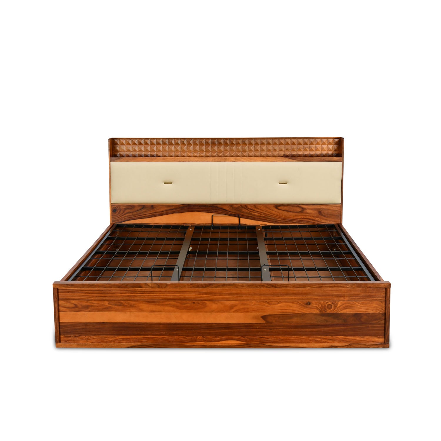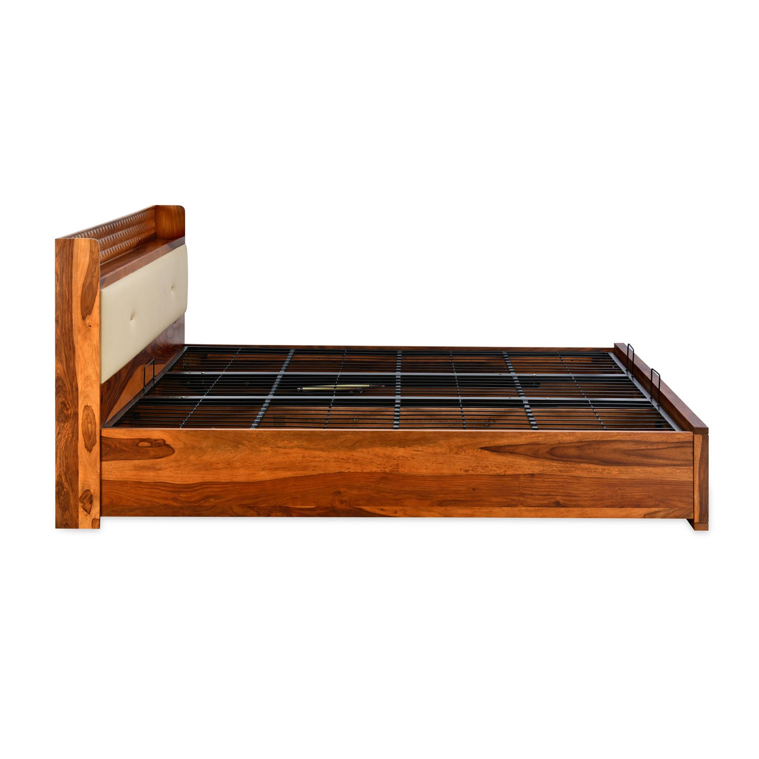Furnish your bedroom with the stylish aesthetics of the Dewsbury Queen Bed. Its flawless modern design with a classic twist makes it the focal point of any bedroom. It has a stunning headboard that features a striking design with plush upholstery. The headboard, footboard, and side panels of the bed are made of Sheesham wood and engineered wood to strengthen the structure. The firm MDF panels on the inside maintain sturdiness and durability. A robust iron panel effectively supports the mattress’s weight to ensure peaceful sleep. Its hydraulic lift mechanism lets you access the storage space conveniently. The storage space comprises three sections to organise and store your belongings spaciously. You can store clothes, pillows or bedsheets in these sections and keep them easily accessible. The bed’s walnut shade with a melamine finish adds vibrance to your setting and presents it with a comfy look. Add an extra touch of chic appeal to your bedroom with the Dewsbury Queen Bed.
