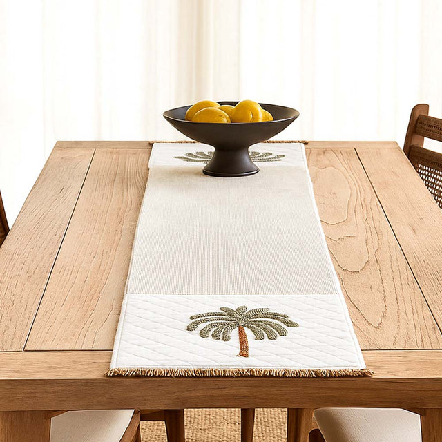 Palm Tree Embroidery Cotton Table Runner Large- Beige and Brown