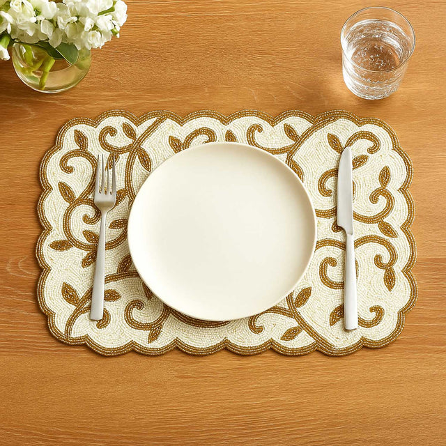 Leaf Beaded Polyester Table Placemat- Gold and Off-white