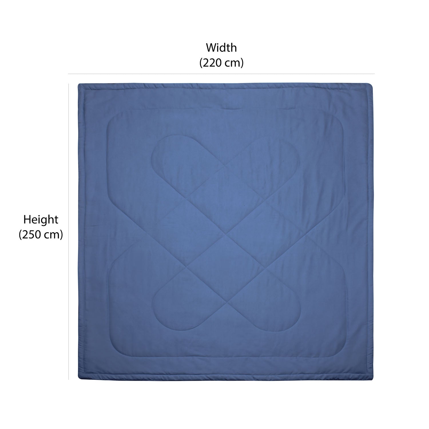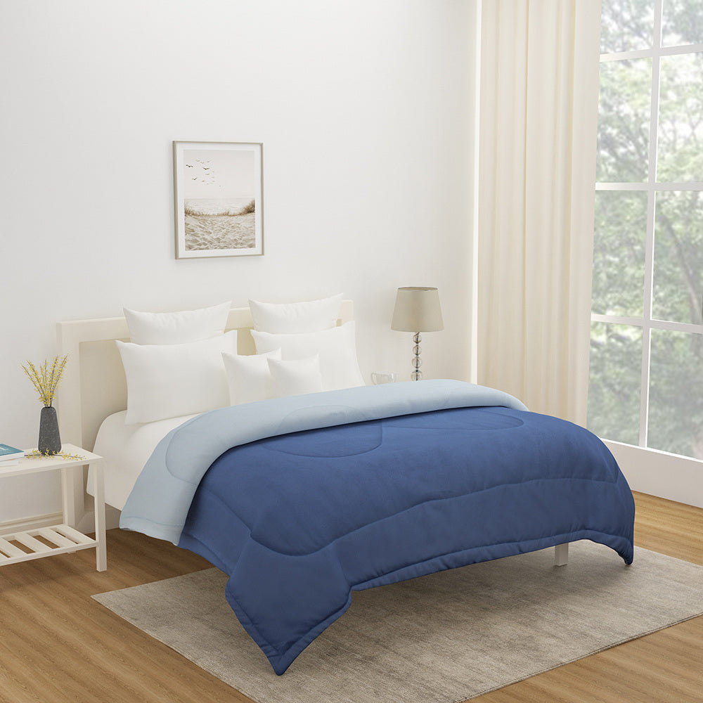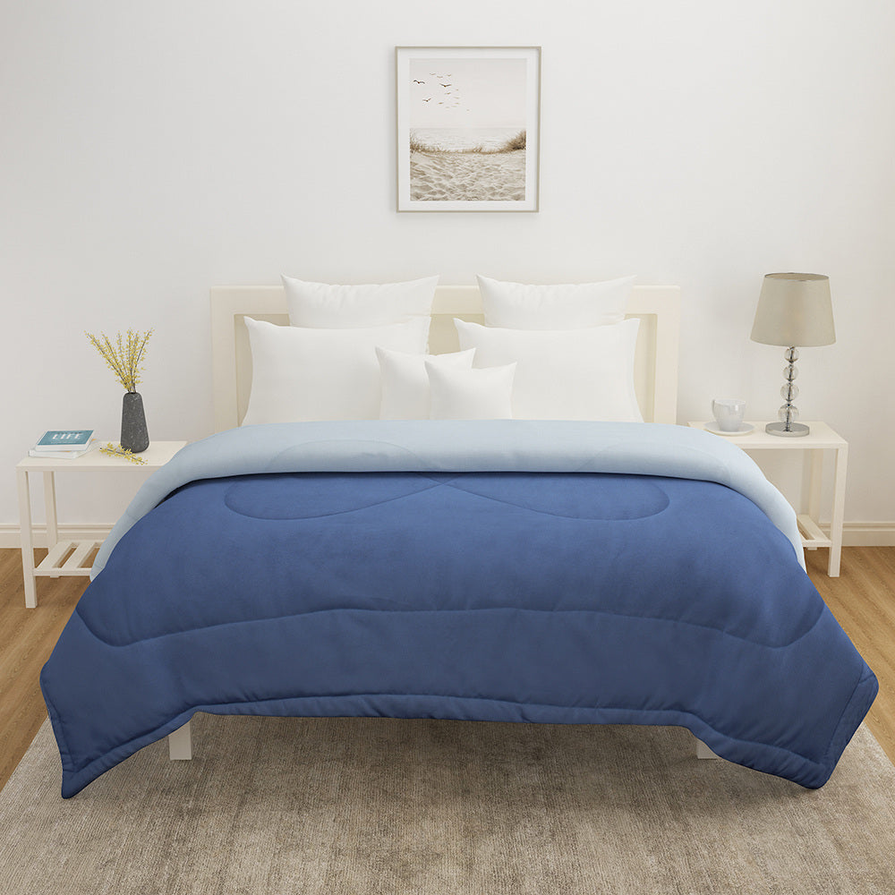 The Nilkamal Homes Comforter combines functionality and style, enhancing the look of your bedroom. It is designed to fit double beds and has a reversible feature with dual shades, enabling you to update your decor with ease. The high-quality polyester fabric delivers lasting softness and durability, while the 150 GSM weight provides warmth without feeling heavy. The sophisticated blue hue enhances the aesthetic appeal, blending seamlessly with various decor styles. Enjoy a cozy and comfortable sleep every night with this thoughtfully designed comforter.