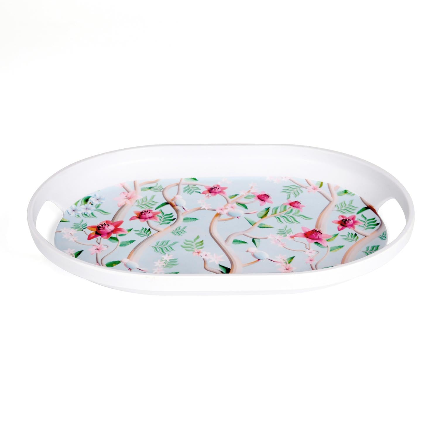 Oval Shaped Melamine Floral Serving Tray with Handle Medium- Blue