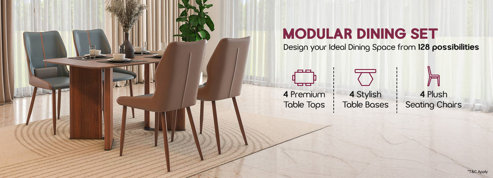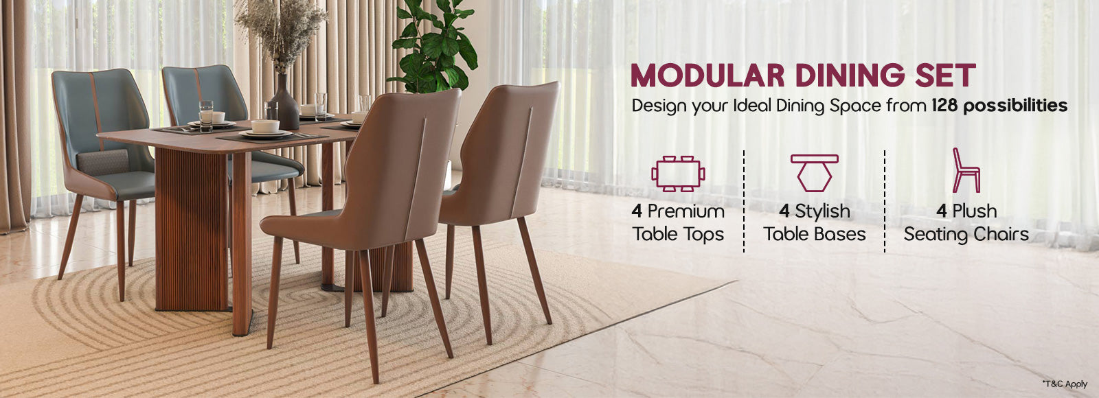 Modular dining means you can choose the different parts of your dining set—like the tabletop, base, and chairs—to create a look that suits your home. It’s a concept that lets you customise the style based on your space, whether you live in a compact apartment or a spacious home.