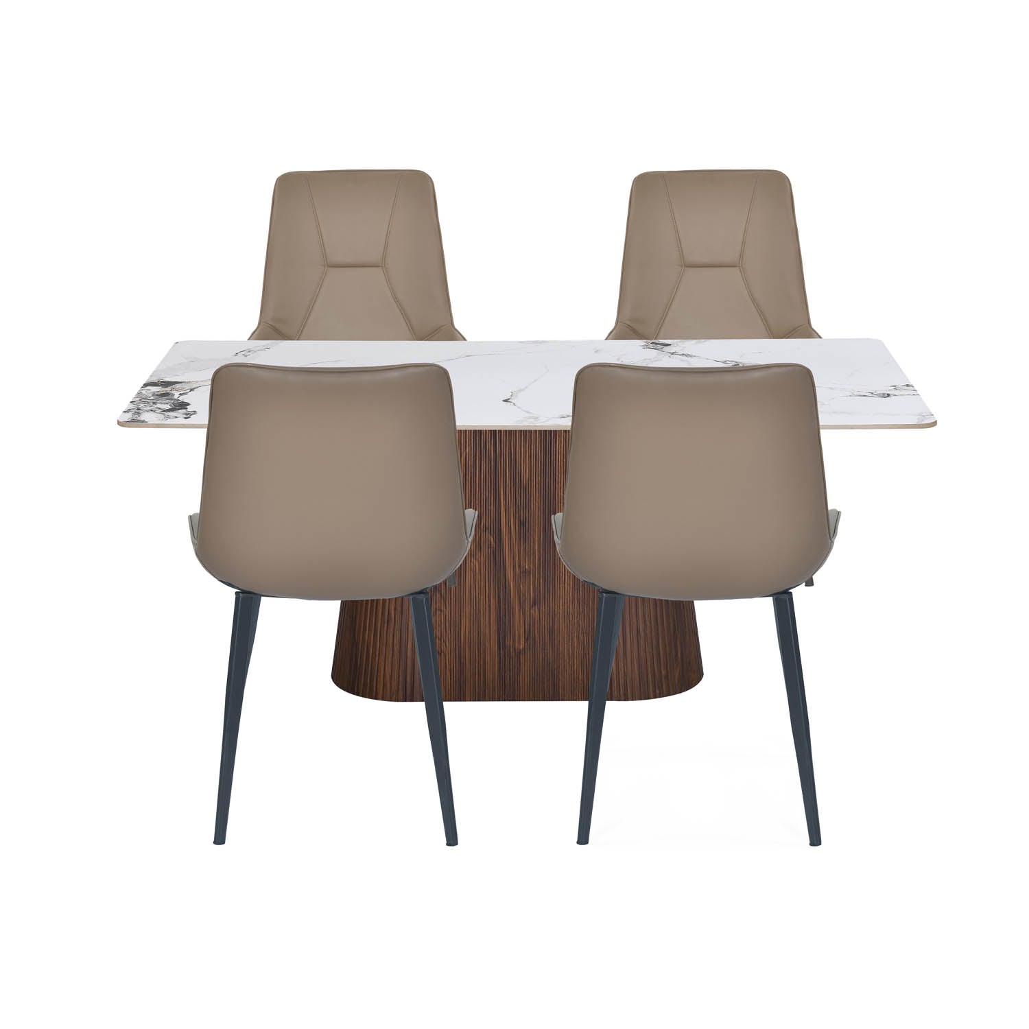 Enhance your dining area with this Flinda Alune 4 Seater Dining Table Set, designed with a sleek and modern look that instantly elevates any home. The ceramic tabletop in a clean white finish adds a premium touch and features an easy‑care surface that resists heat, scratches, and stains for long‑lasting beauty. Its sturdy pyramid-shaped base with fluted detailing provides both style and stability, crafted from durable engineered wood for strength over time. The chairs come upholstered in soft leatherette for a luxurious feel and effortless cleaning, while the angled quilted backrest offers excellent ergonomic comfort during long meals. Supported by a durable metal frame for reliable stability, this set is ideal for family dinners, hosting guests, or creating a warm, inviting dining experience in modern apartments or homes.