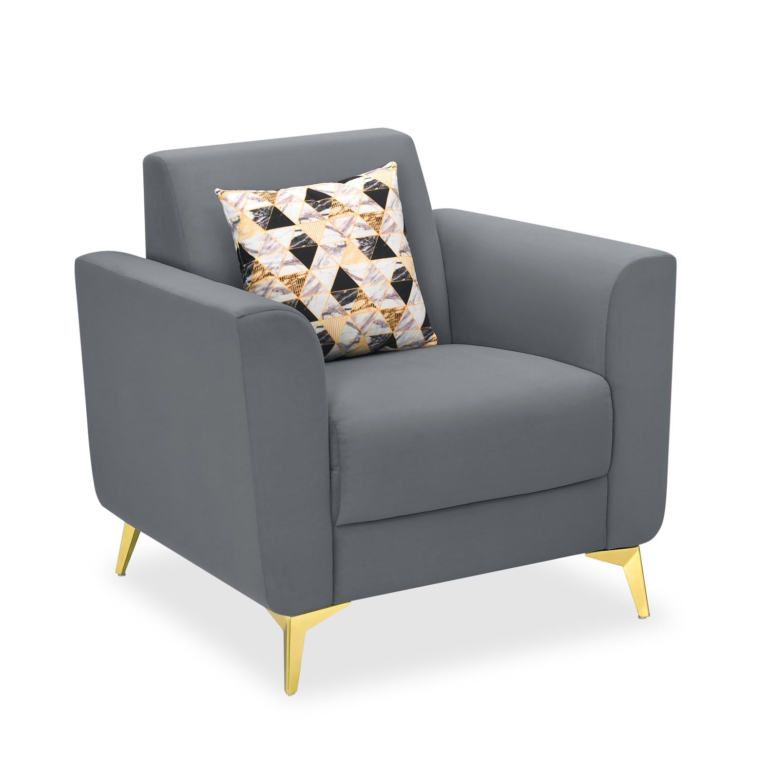 Nilkamal Homes' Cooper 1-Seater Sofa showcases a sleek, modern metallic grey shade that brings calm, balance, and a refined sense of sophistication to your living space. Its well-cushioned seat offers exceptional comfort, making it ideal for relaxing or reading. The ultra-sheen polyester upholstery enhances the sofa’s organic charm with a smooth, polished finish. Sleek gold-finish metal legs create a striking contrast against the grey tone, adding a luxurious accent. Built on a solid pine wood and engineered wood base, the Cooper Sofa ensures lasting durability and support for everyday use. As a 1-seater, it becomes your personal retreat—perfect for solo lounging, reading, or a quiet coffee break.