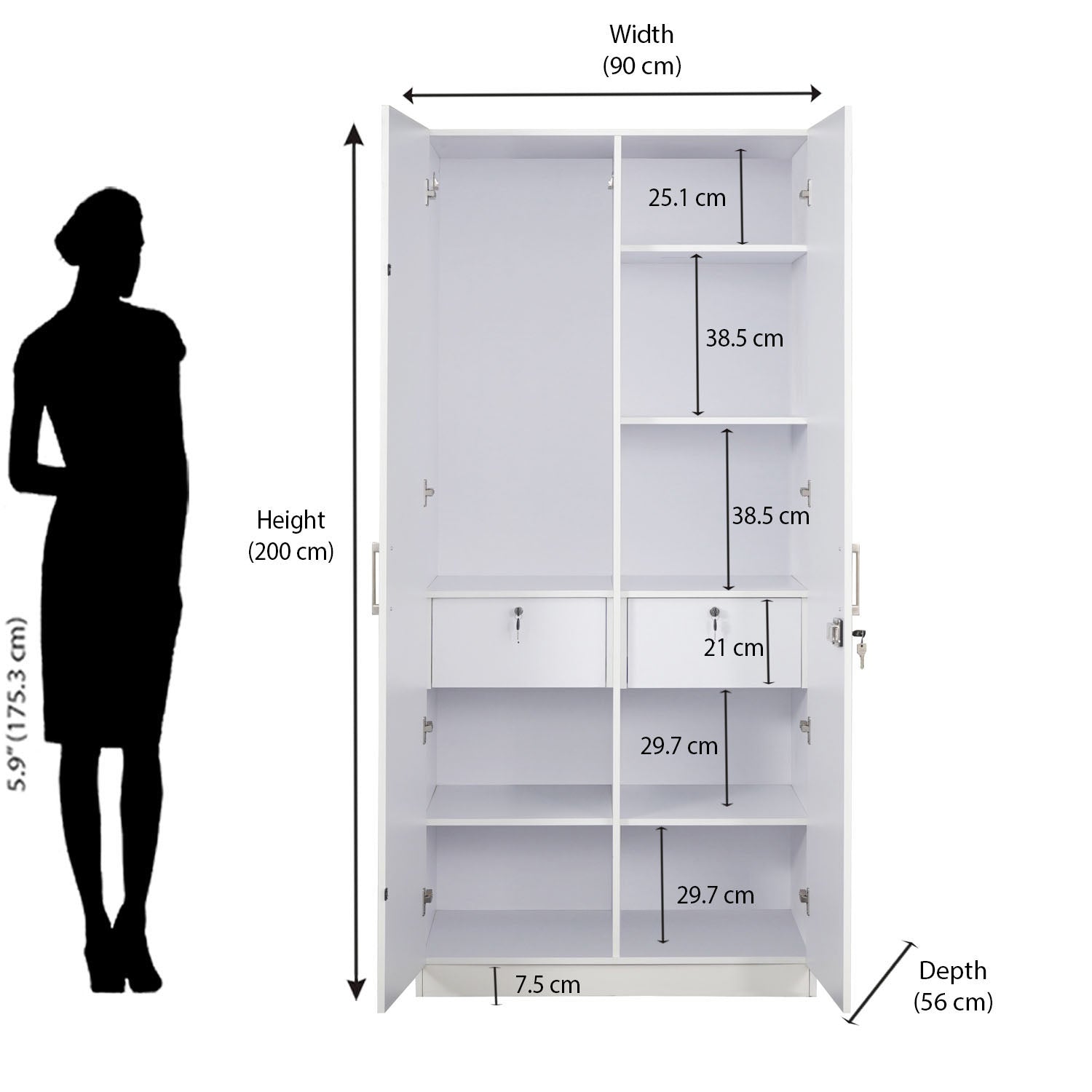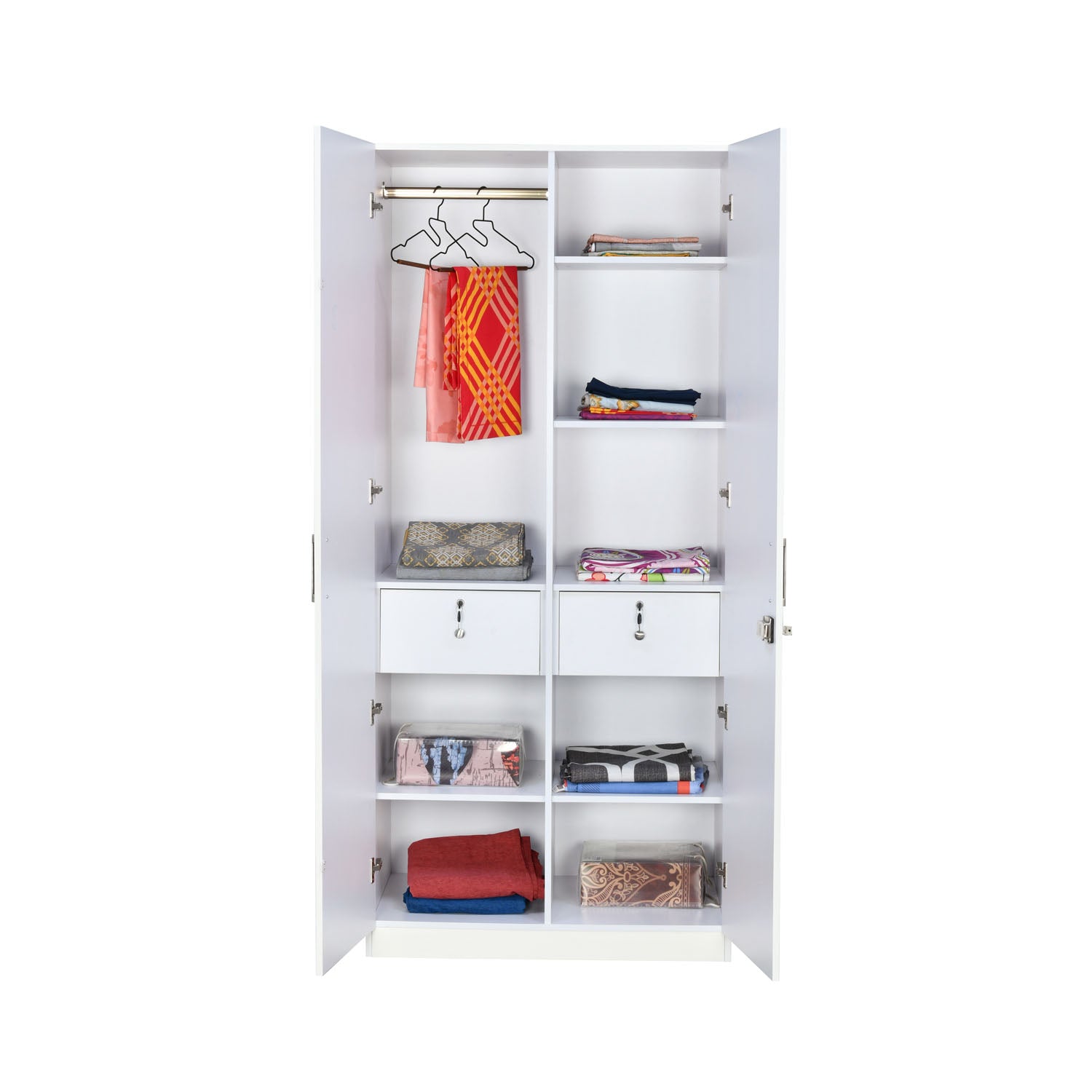Do you need a place to organise your fashionable and everyday outfits? If so, then the Max 2-Door Wardrobe is the right choice for you. This durable particle board wardrobe by Nilkamal Homes is specifically designed to meet your storage needs and organise your belongings. It has eight spacious storage compartments, including one long section at the top to keep multiple outfits together. The remaining compartments categorise your belongings to make them easier to locate. For securing valuables and important papers, the Max Wardrobe has two drawers. To ensure the safety of your belongings, you can use the lock on the drawers and doors when not in use. Even in terms of design, its striking frosty white colour and clean lines complement any style of décor. Maximize your wardrobe space without sacrificing style with the Max 2-Door Wardrobe.