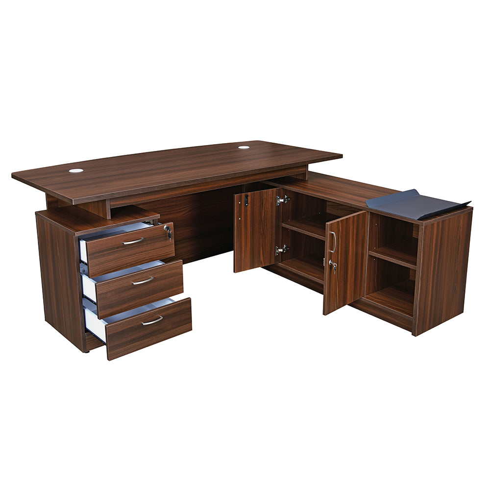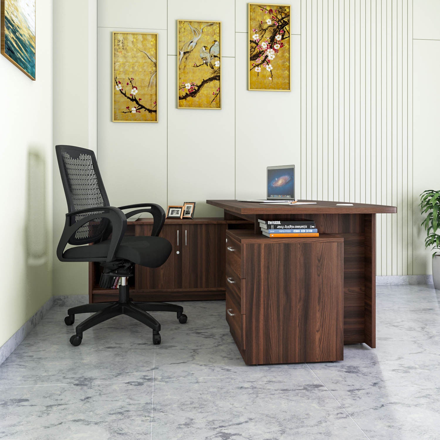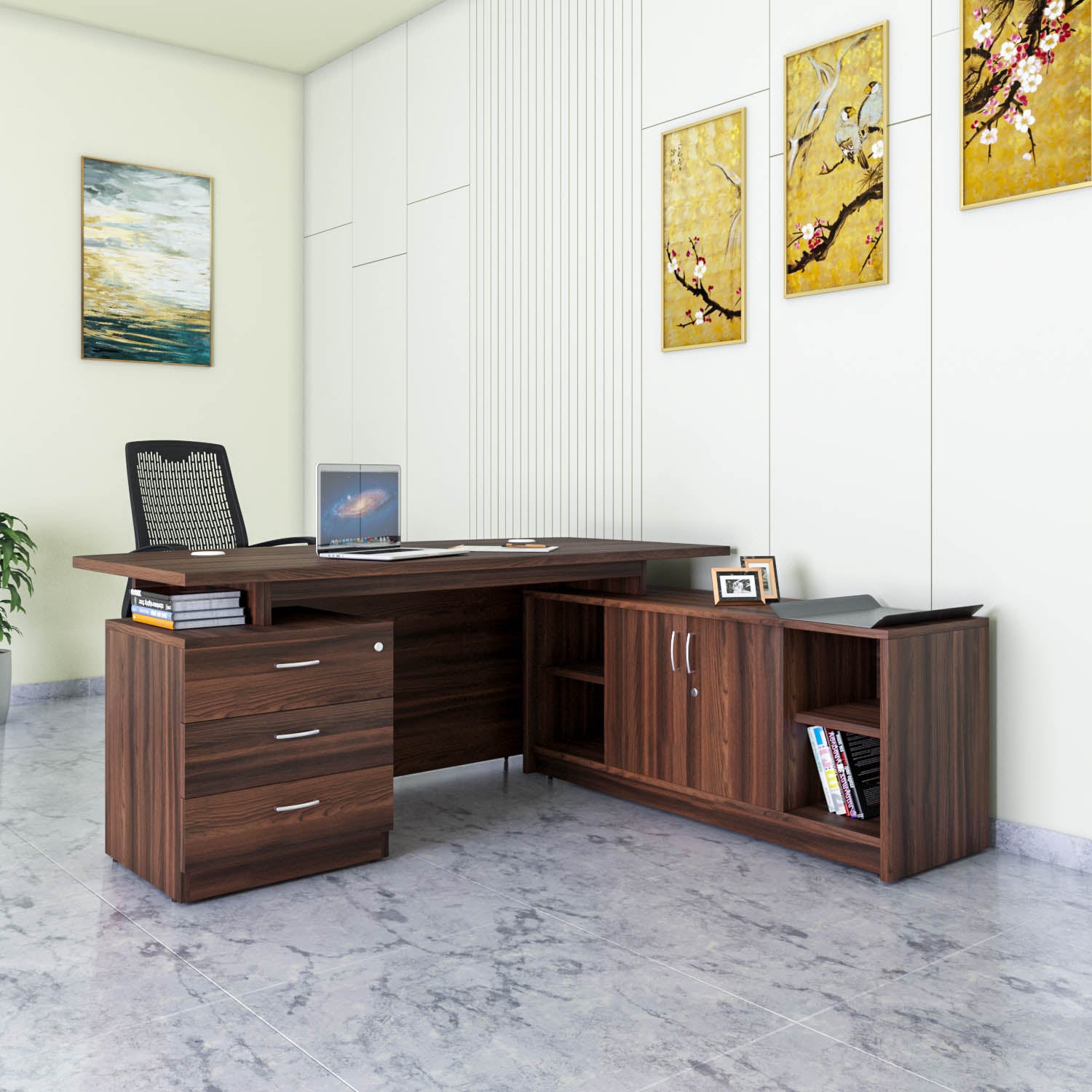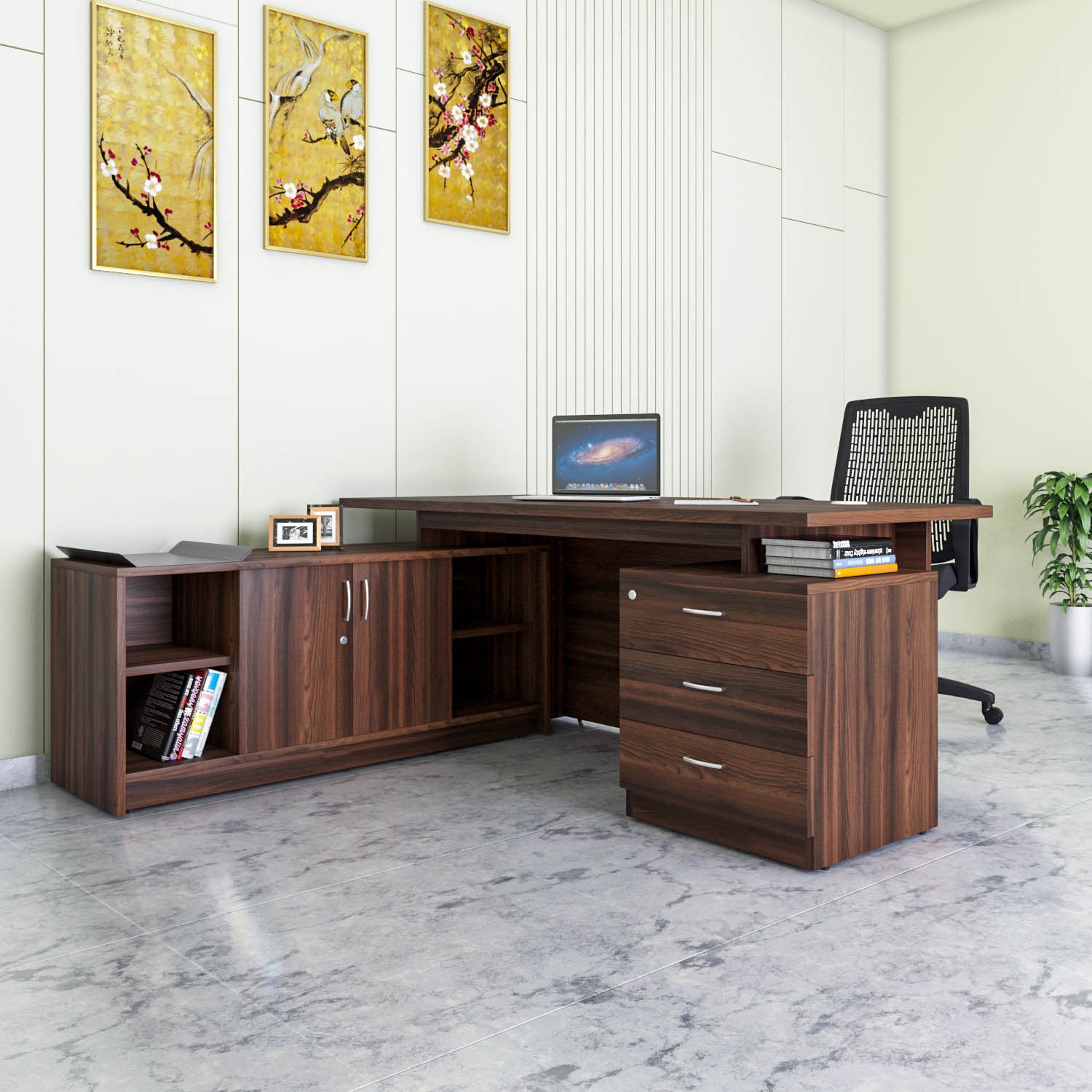The Nilkamal Elegant Neo Office Table is constructed from sturdy engineered wood, ensuring durability and reliability. It boasts a spacious wide tabletop, providing ample room for work essentials. Customers can choose to install the drawer and shelf sections on the either left or right side, making it adaptable to various setups. With a cabinet, four open shelves, and three drawers equipped with a single locking system, it offers convenient storage options for files, stationery, and personal items. This office table is ideal for home offices and professional settings, combining functionality with a sleek and modern design.