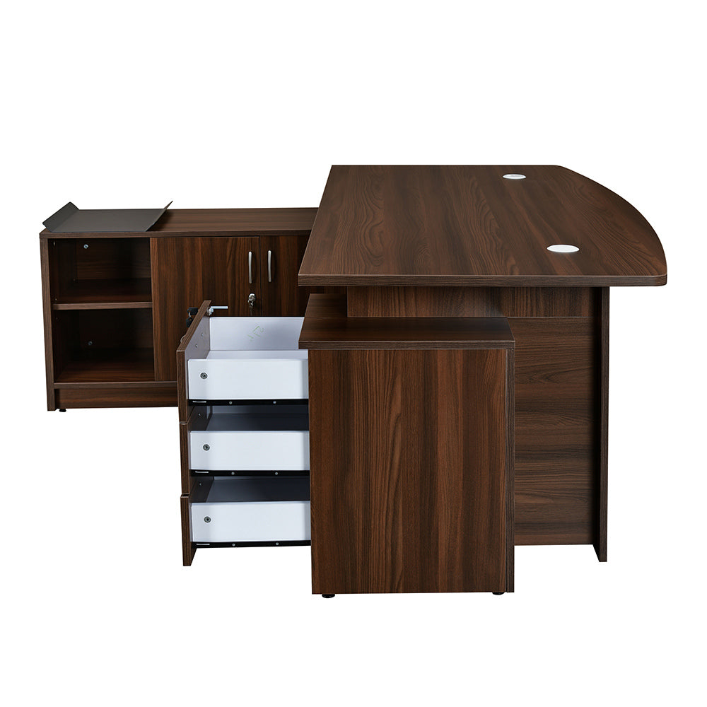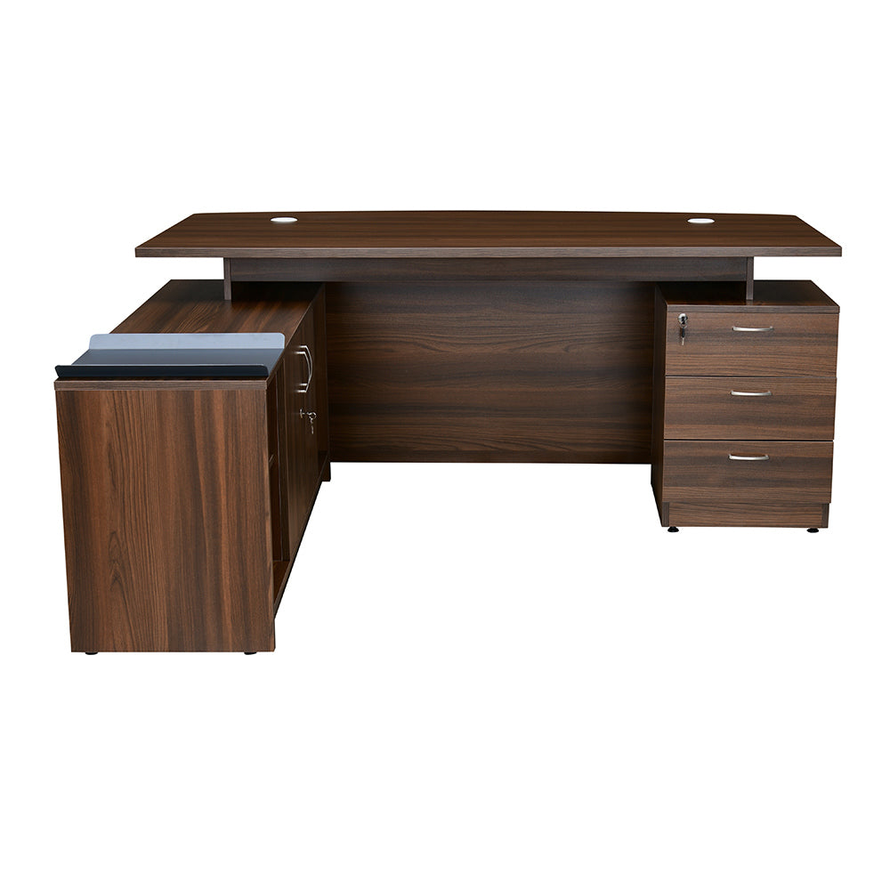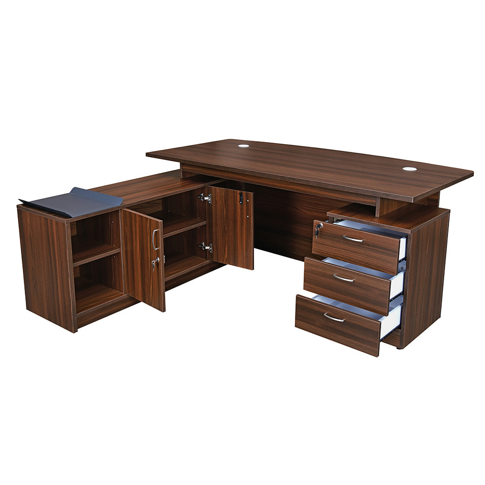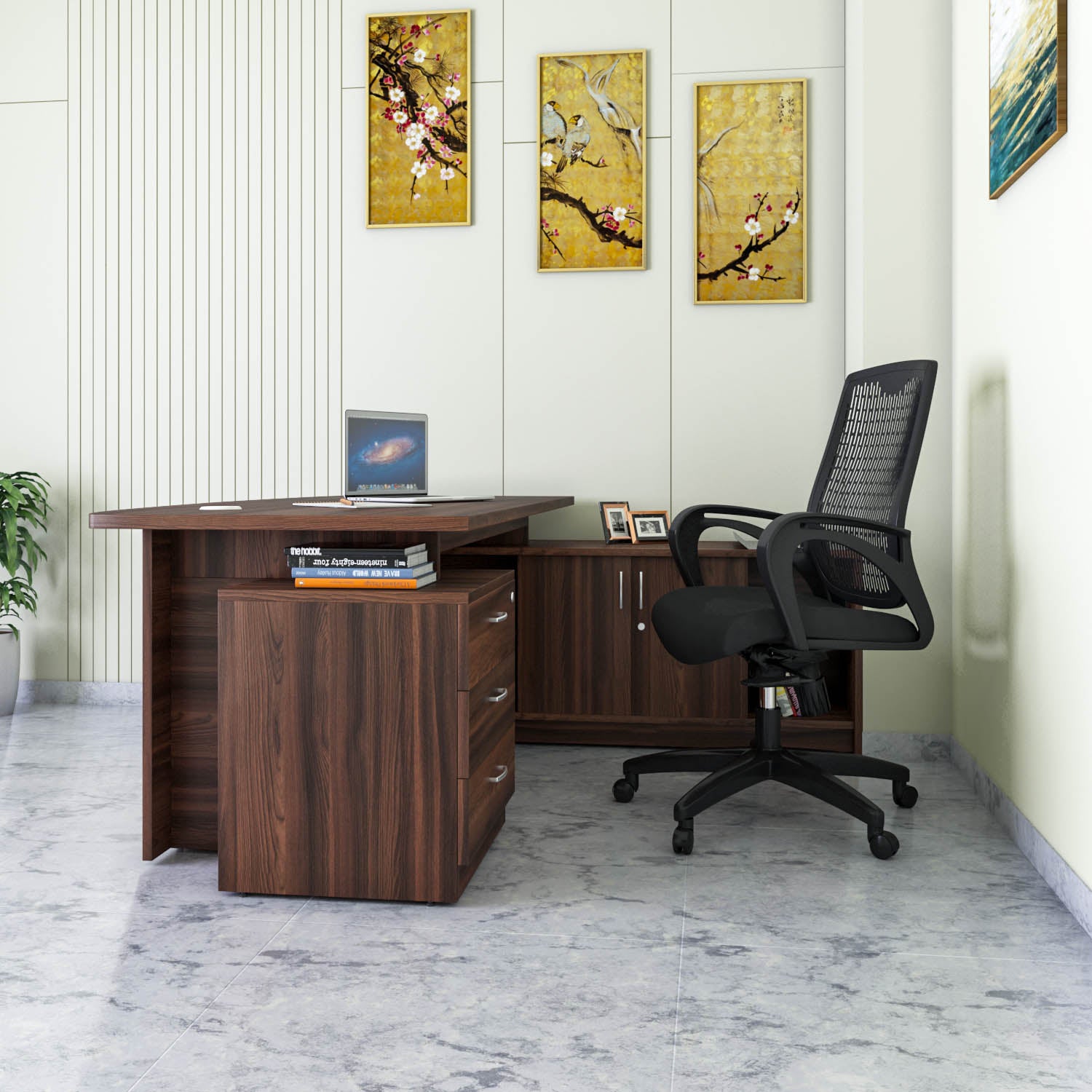 The Nilkamal Elegant Neo Office Table is constructed from sturdy engineered wood, ensuring durability and reliability. It boasts a spacious wide tabletop, providing ample room for work essentials. Customers can choose to install the drawer and shelf sections on the either left or right side, making it adaptable to various setups. With a cabinet, four open shelves, and three drawers equipped with a single locking system, it offers convenient storage options for files, stationery, and personal items. This office table is ideal for home offices and professional settings, combining functionality with a sleek and modern design.