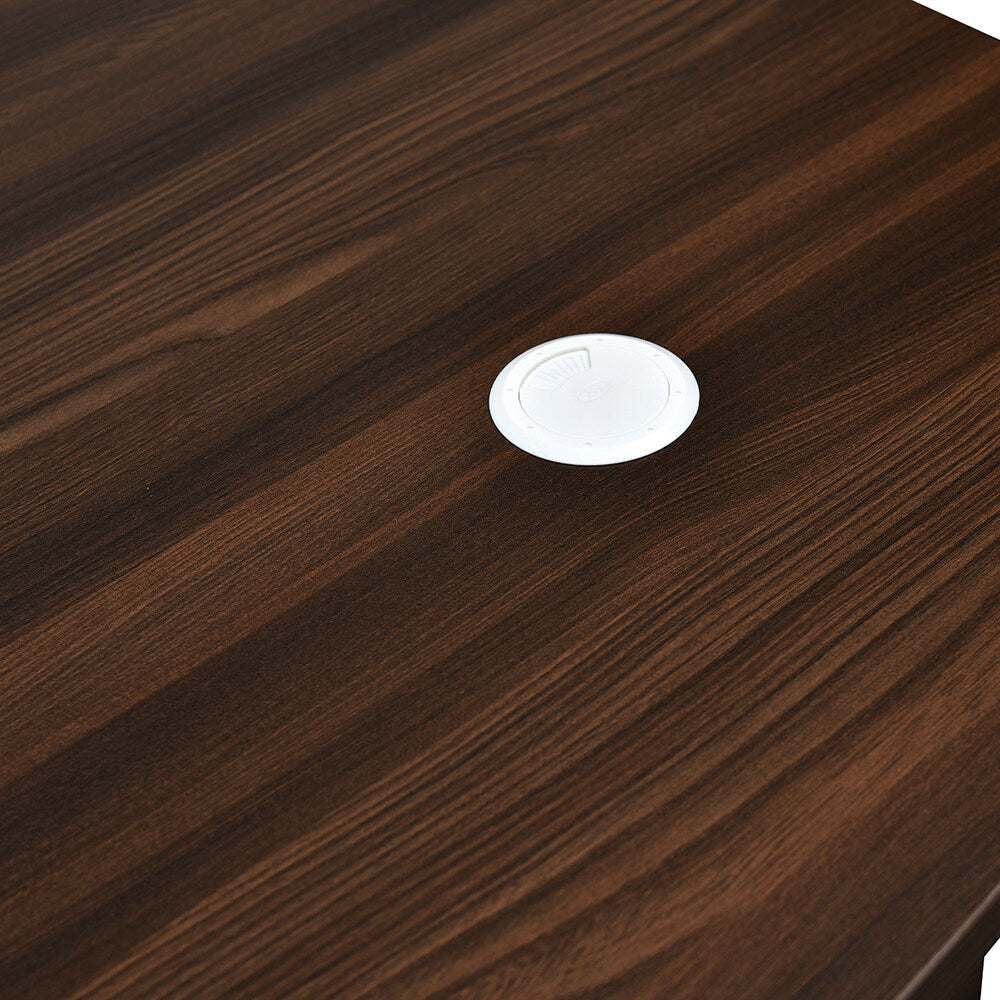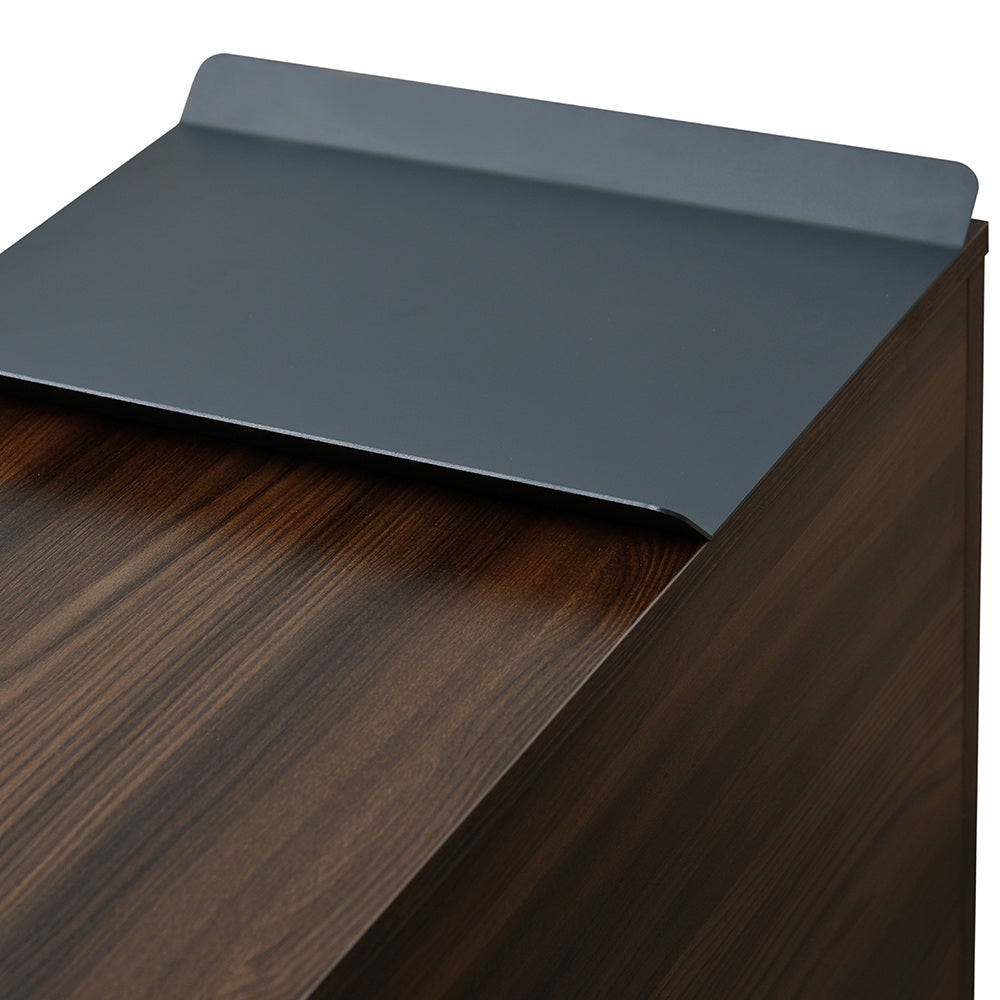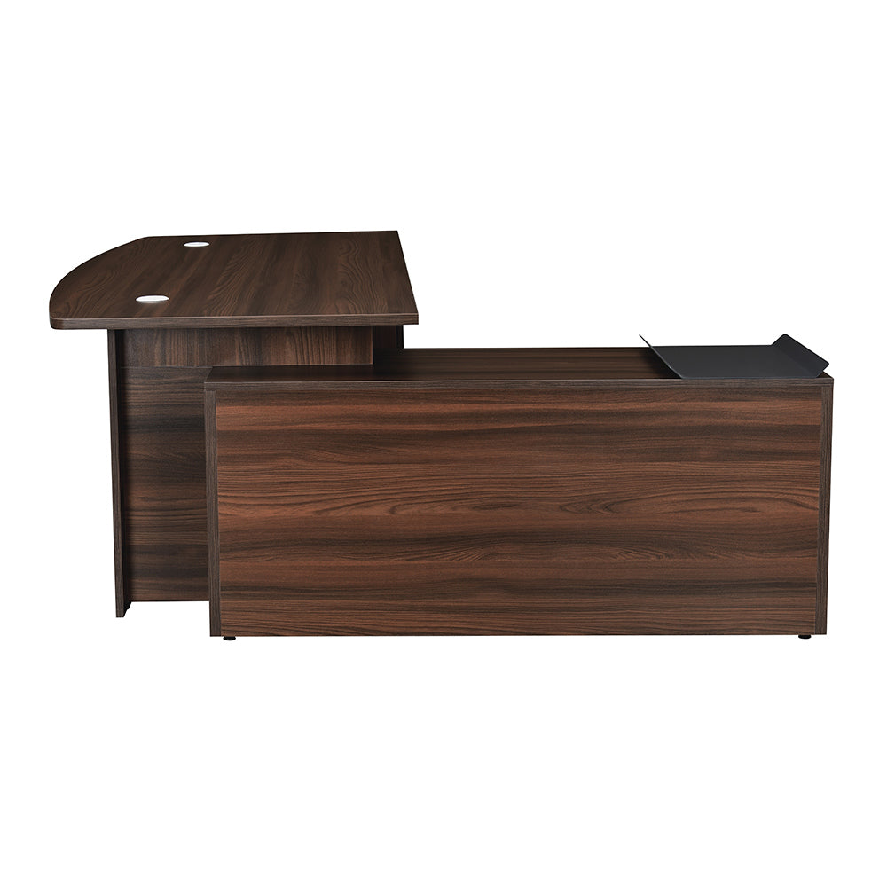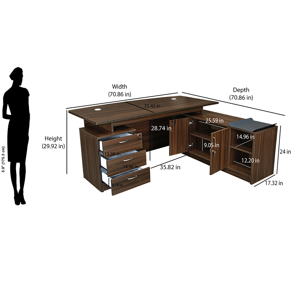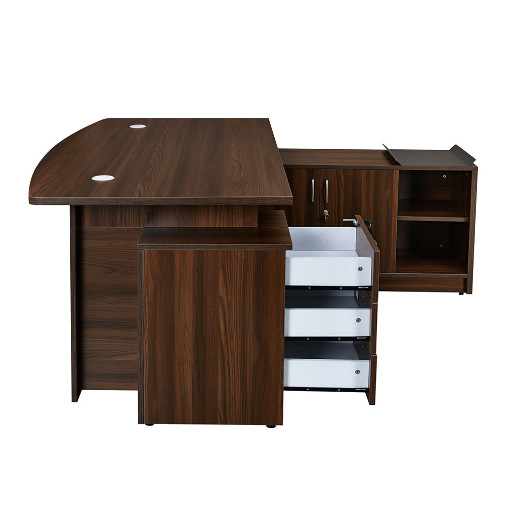 The Nilkamal Elegant Neo Office Table is constructed from sturdy engineered wood, ensuring durability and reliability. It boasts a spacious wide tabletop, providing ample room for work essentials. Customers can choose to install the drawer and shelf sections on the either left or right side, making it adaptable to various setups. With a cabinet, four open shelves, and three drawers equipped with a single locking system, it offers convenient storage options for files, stationery, and personal items. This office table is ideal for home offices and professional settings, combining functionality with a sleek and modern design.