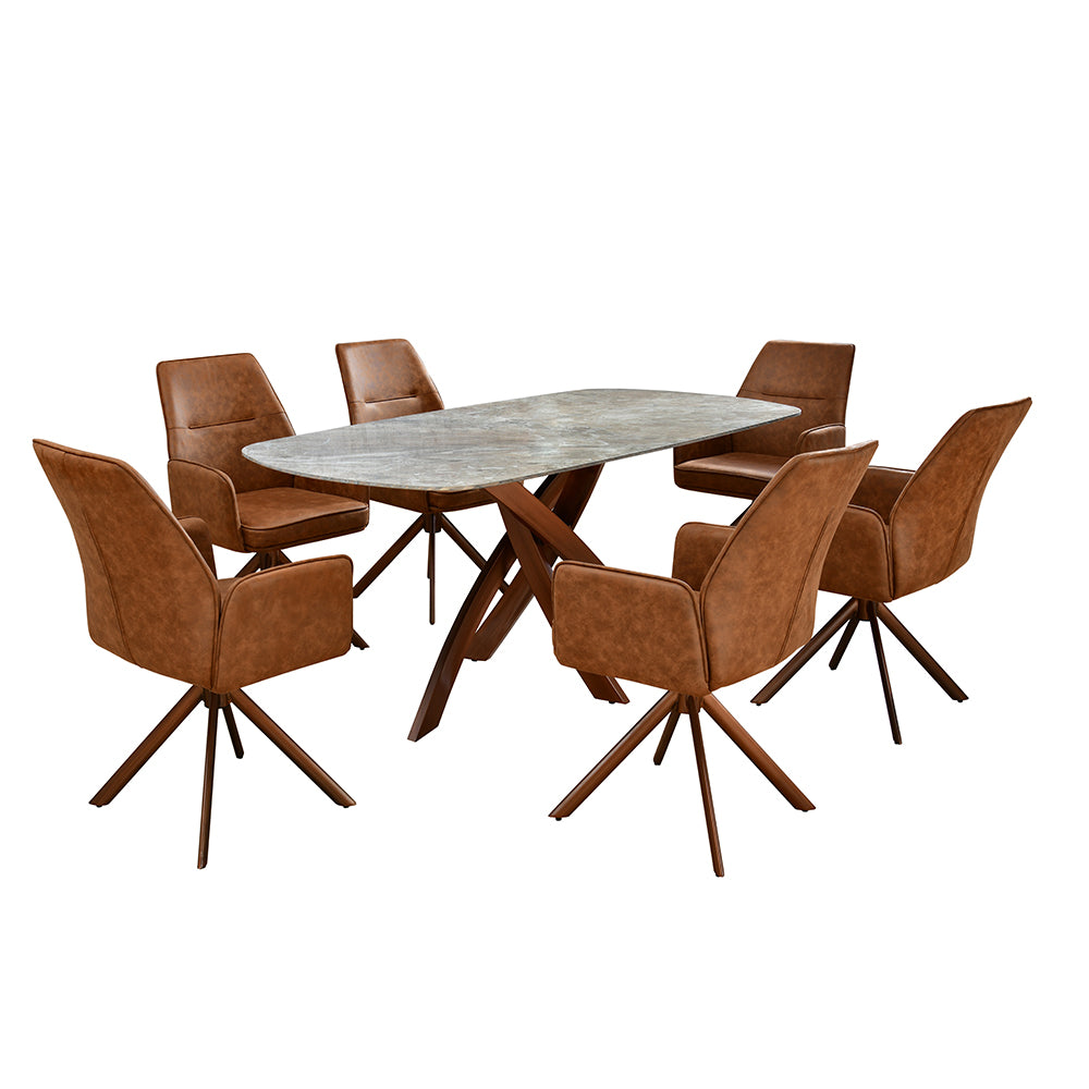 The Nilkamal Homes Polaris 6-Seater Dining Set blends elegance with bold design through its marble-effect brown ceramic top and sturdy engineered wood support. The criss-cross X-shaped base in brushed brass makes a striking impression, while the leather-looking polyester upholstery on the chairs adds luxury. Each chair’s auto-return swivel function allows smooth rotation, automatically restoring them to their original position. Designed as a six-seater, the Polaris provides generous space for everyday meals and special gatherings.